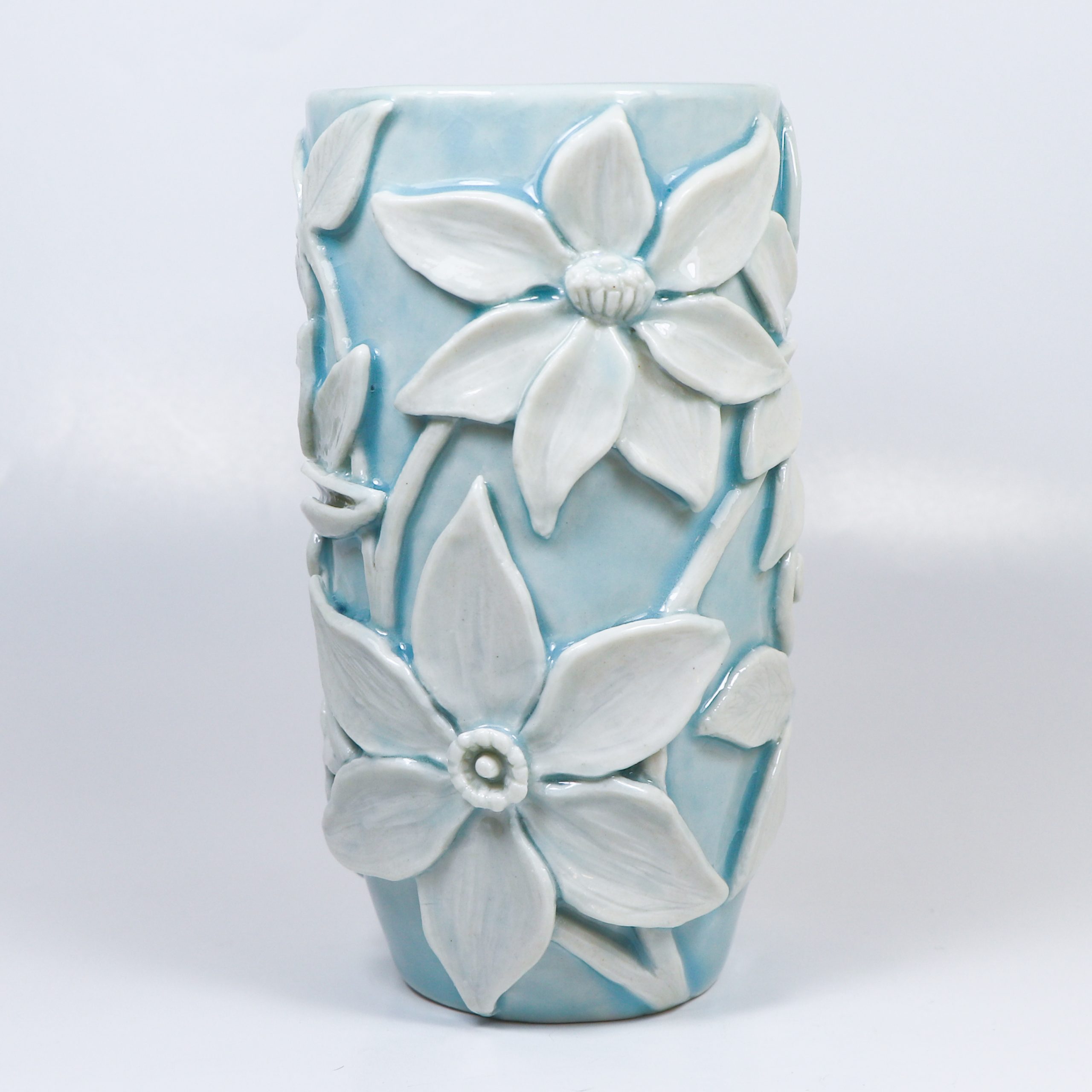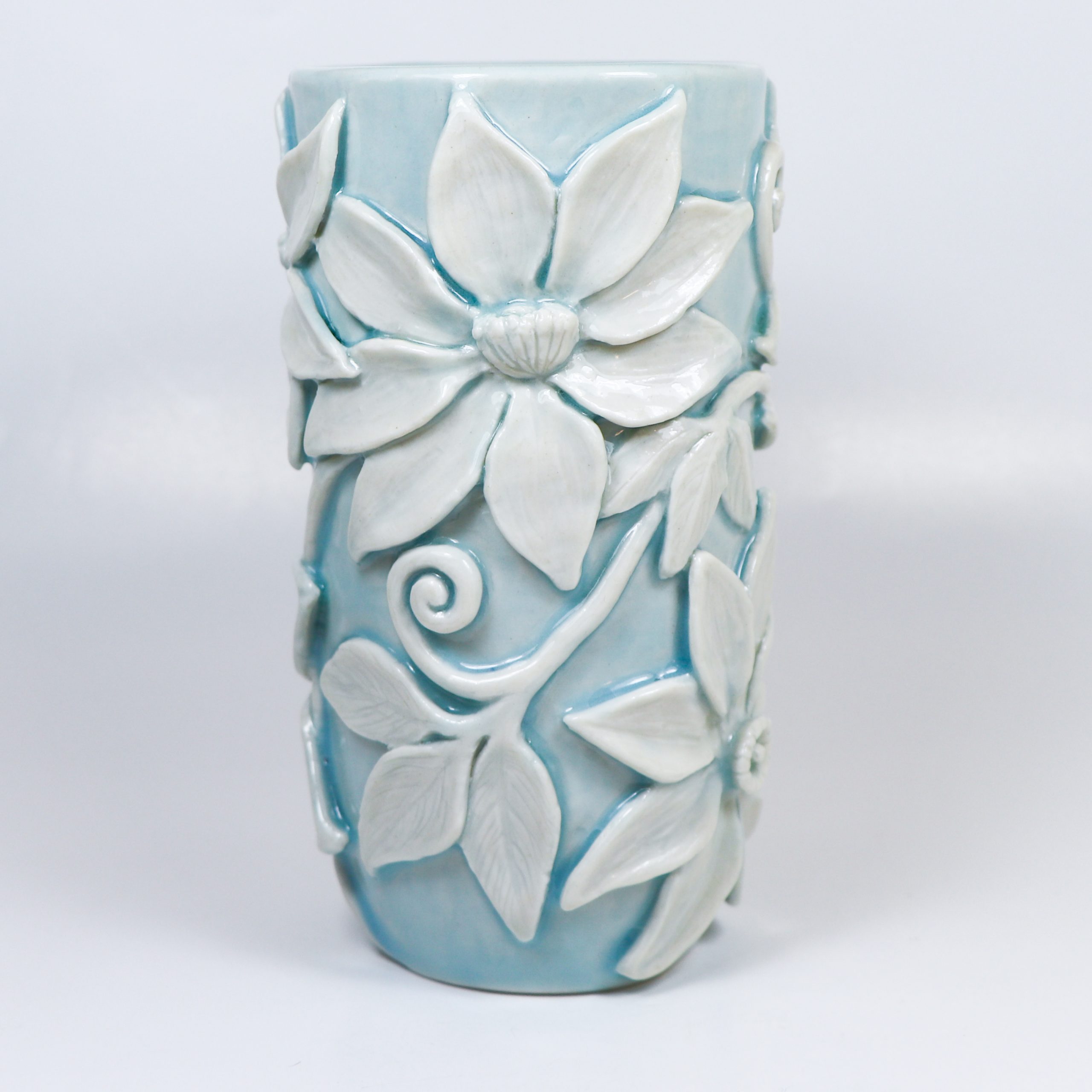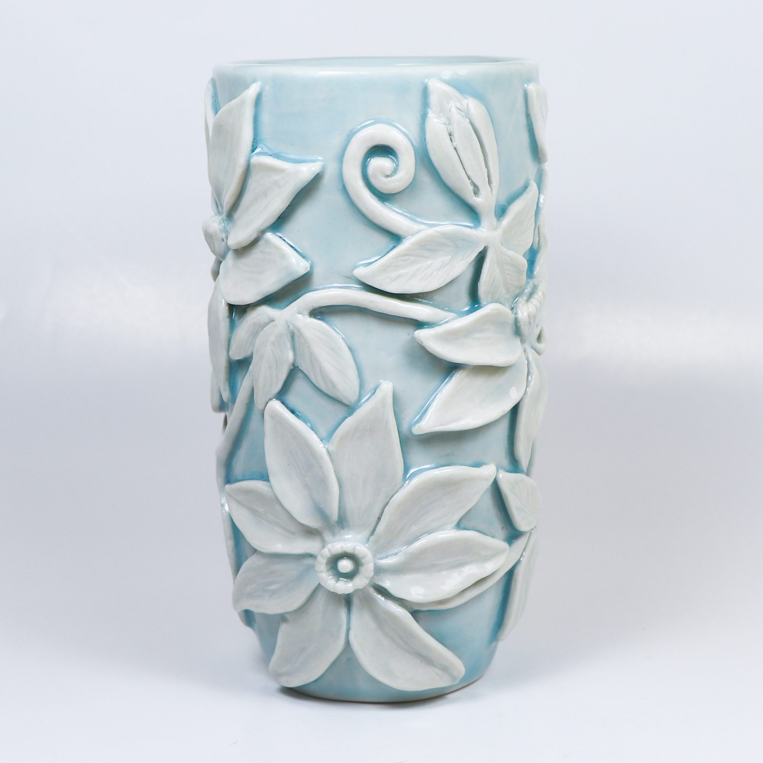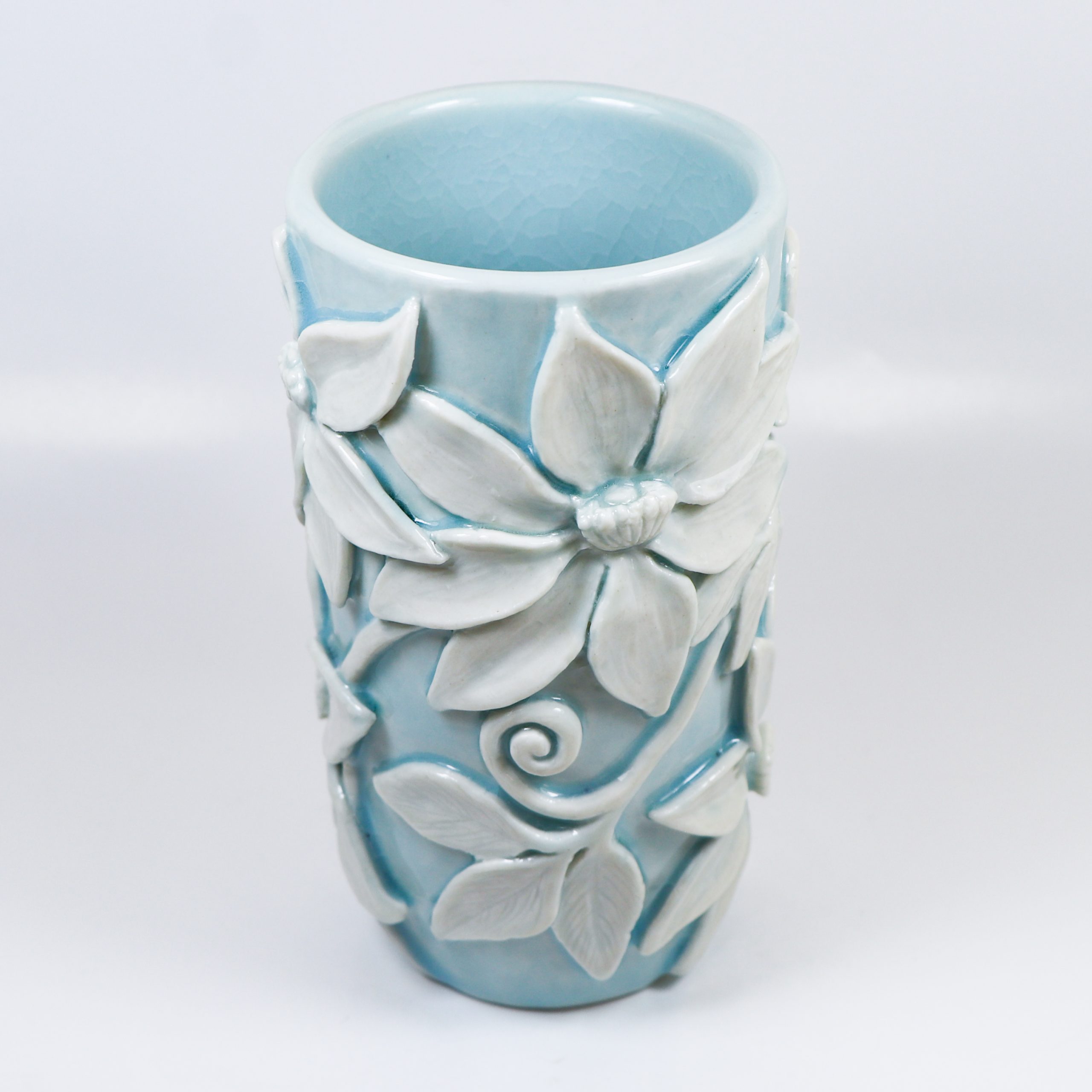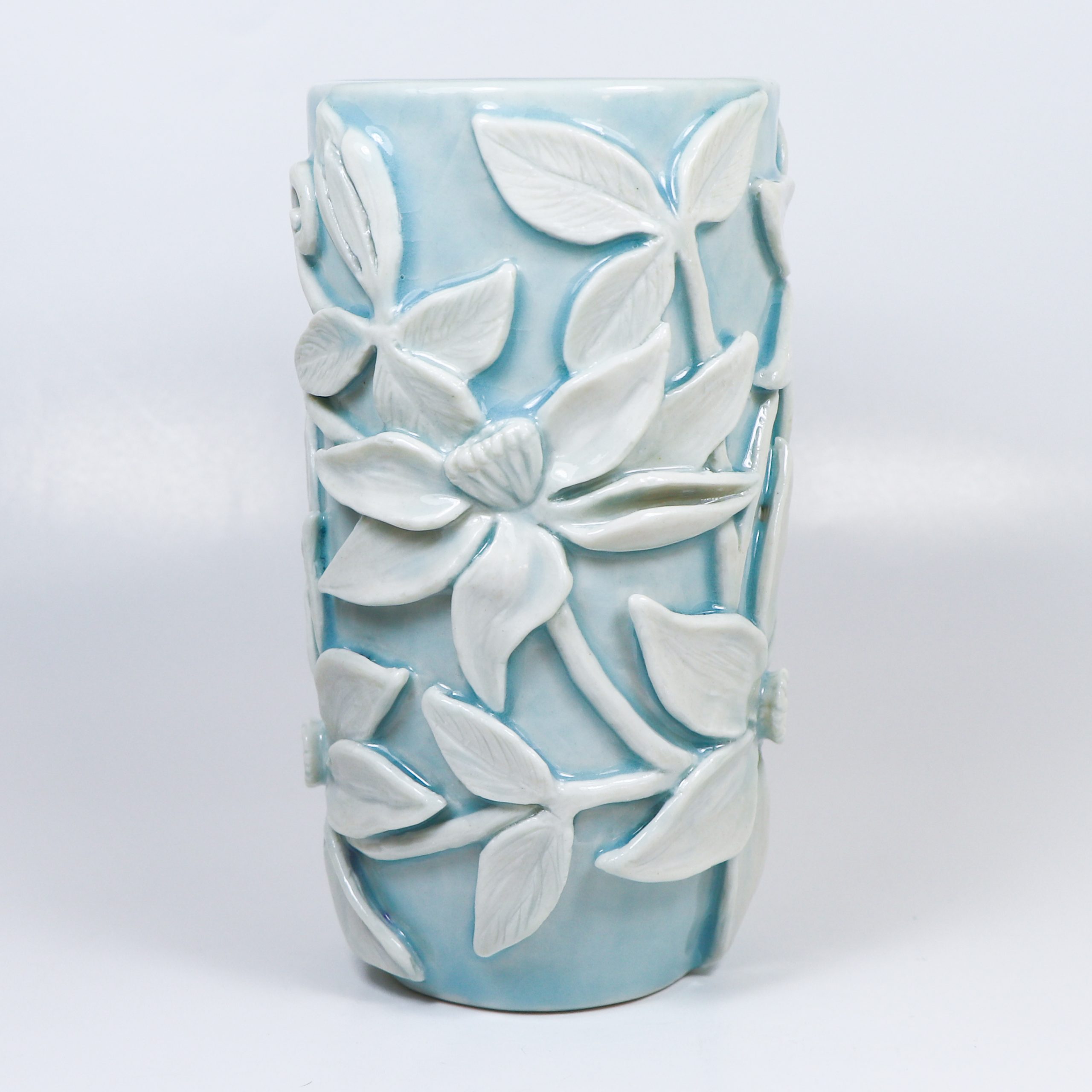 Wheel thrown grolleg porcelain. Hand carved. Cerulean & Micro Pearl glazes. Fired ^6. 5 1/8″h x 2 1/4″w