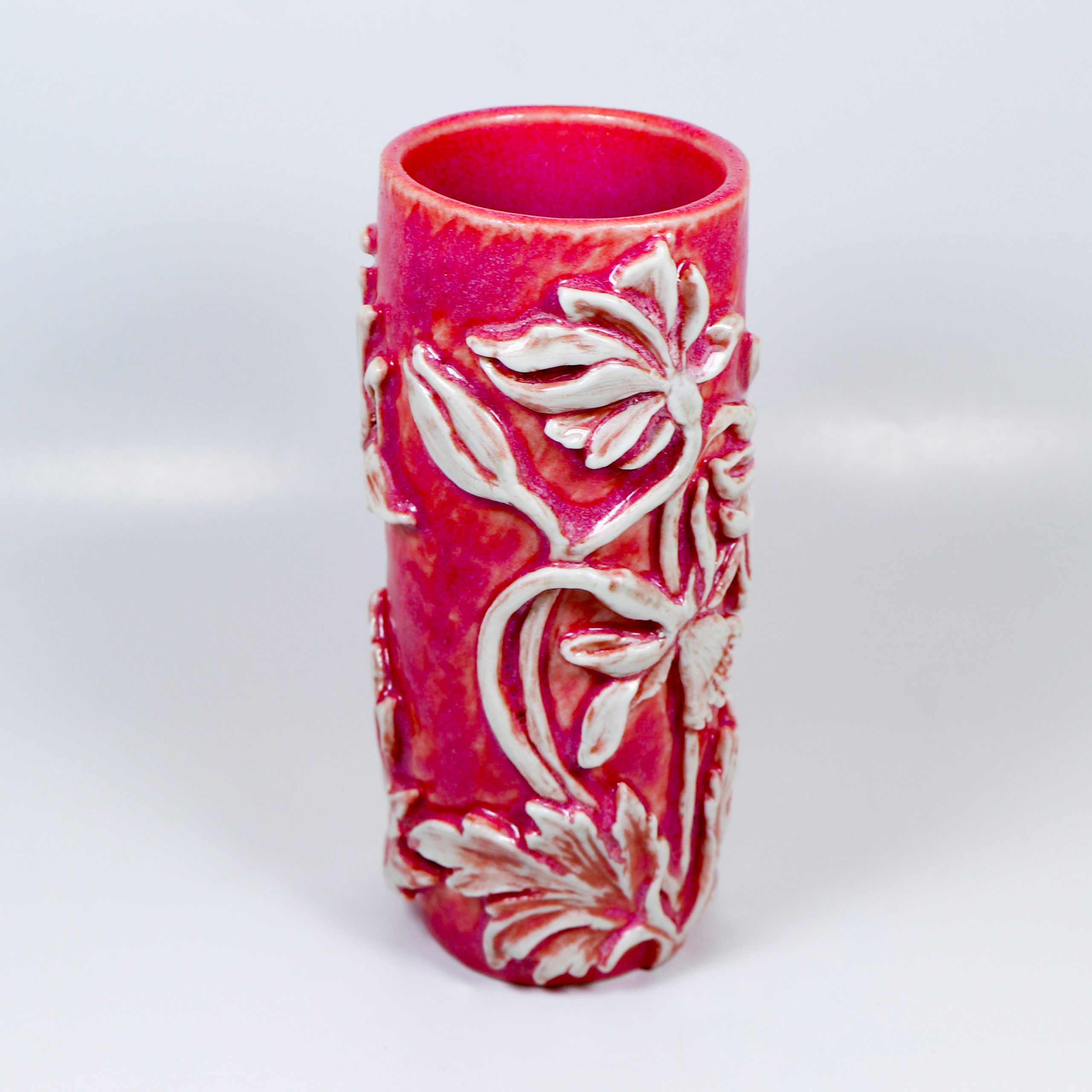 Wheel thrown grolleg porcelain. Hand carved. Fairy Rose & Micro Pearl glazes. Fired ^6. 5″h x 2 1/8″w