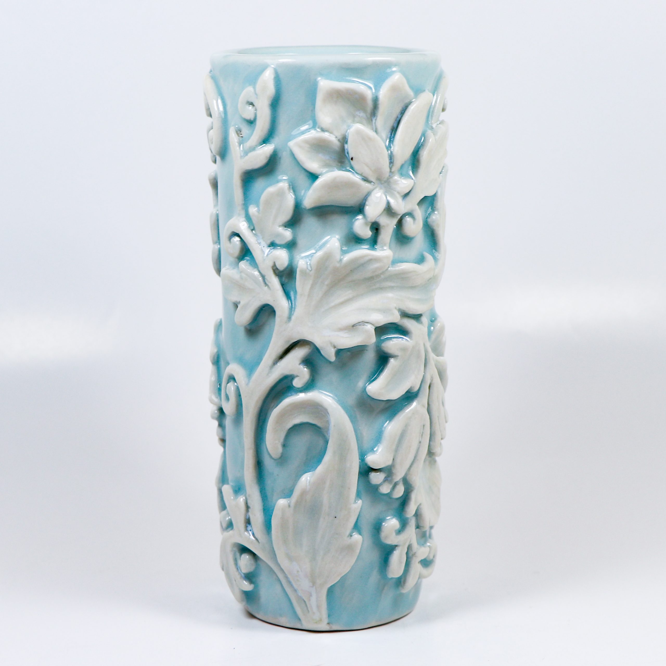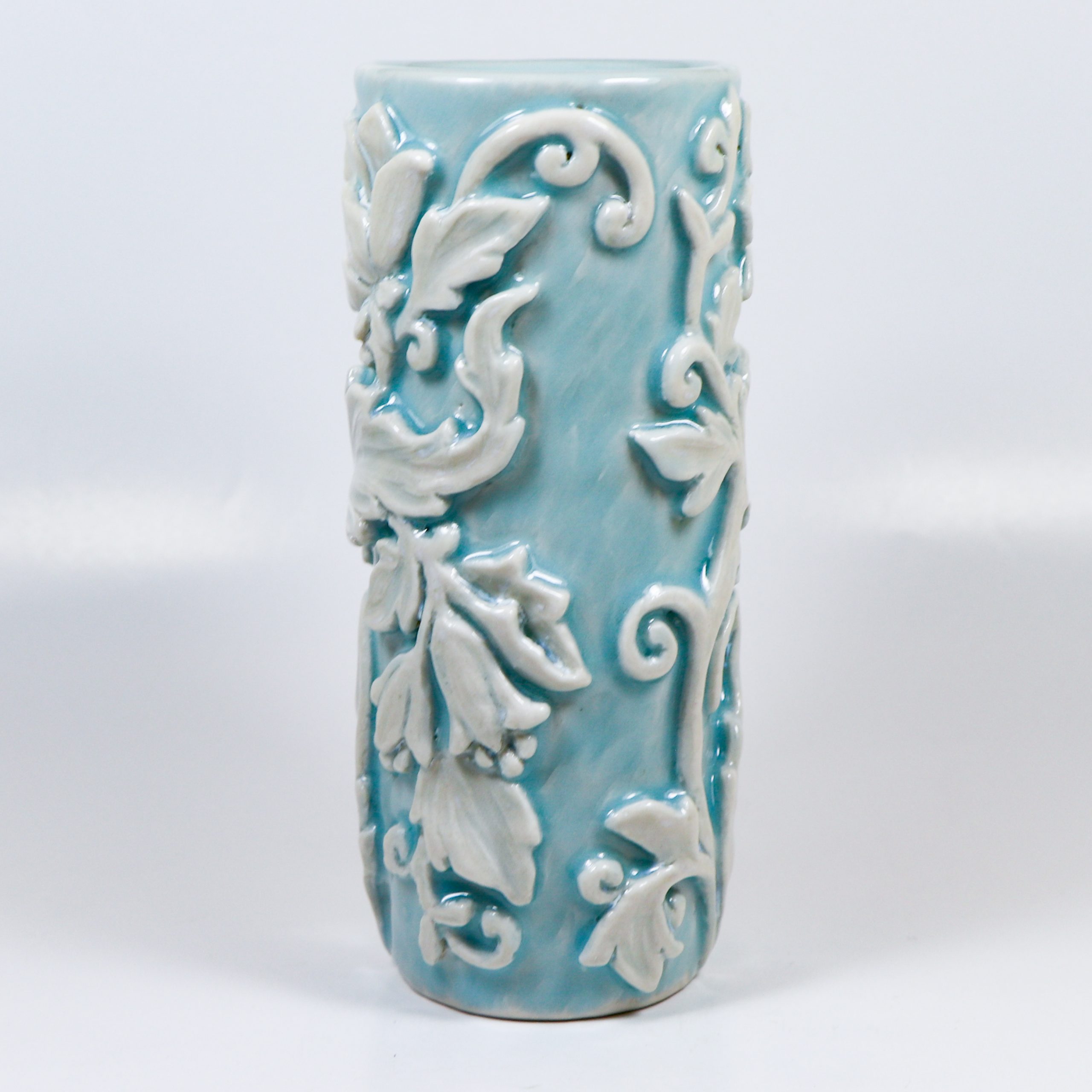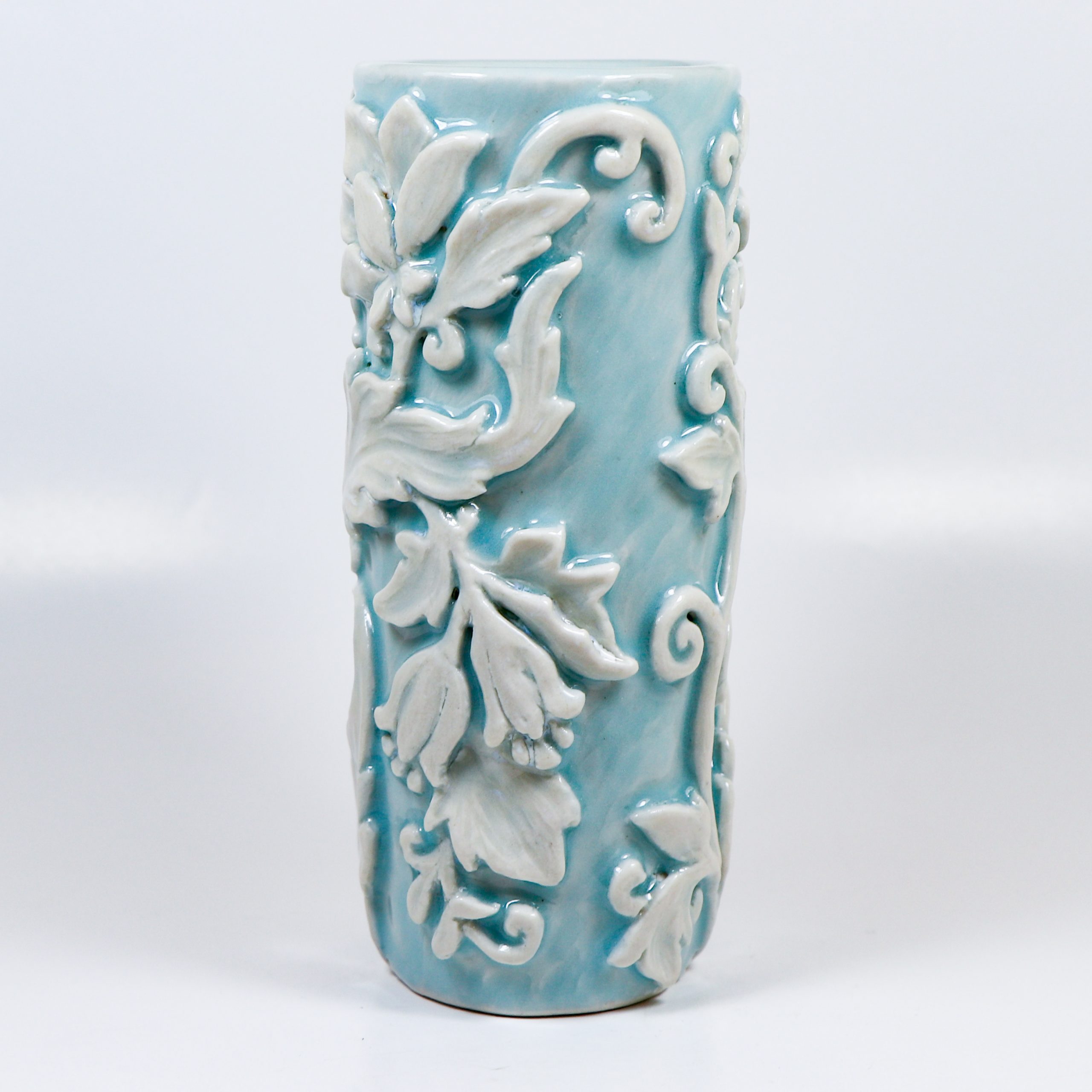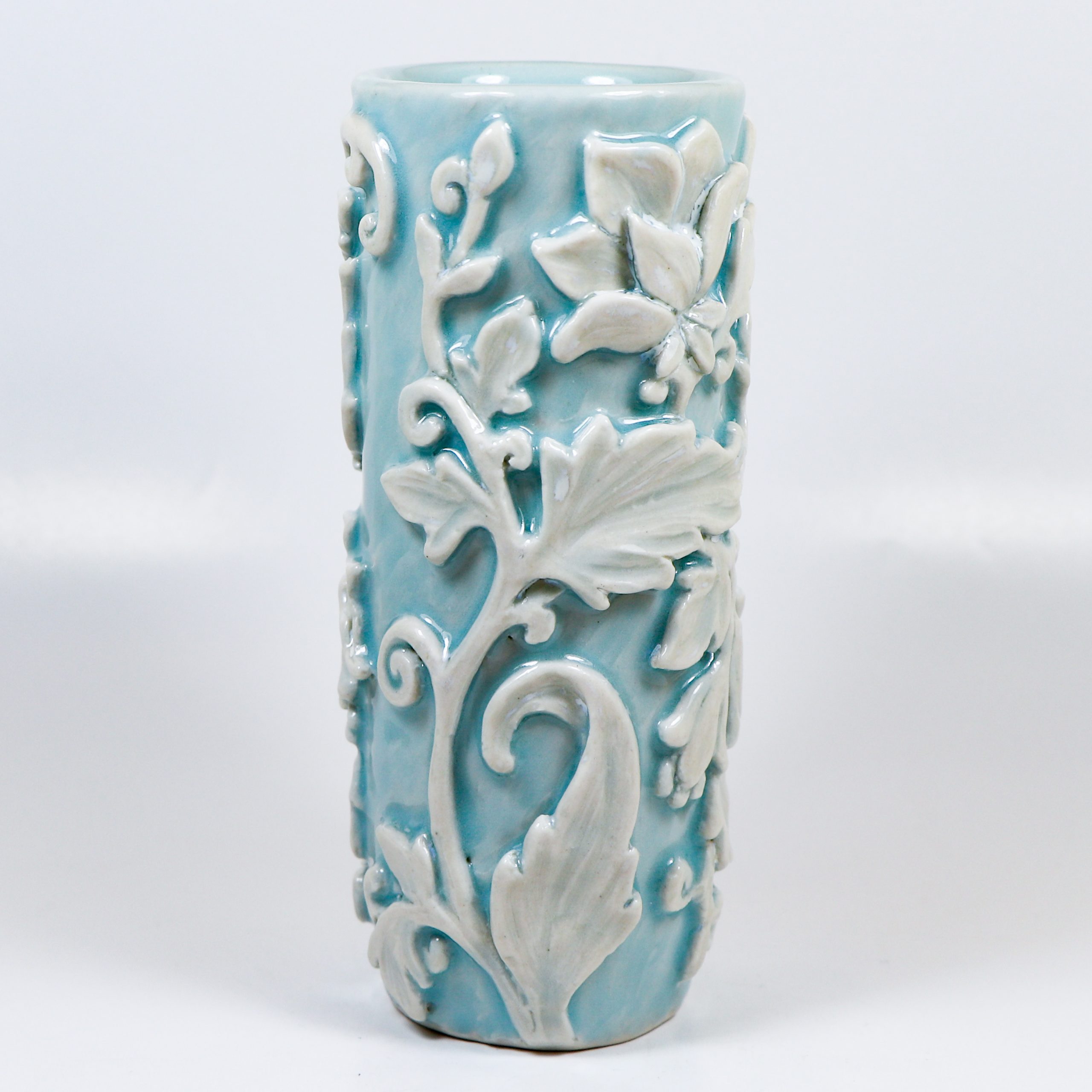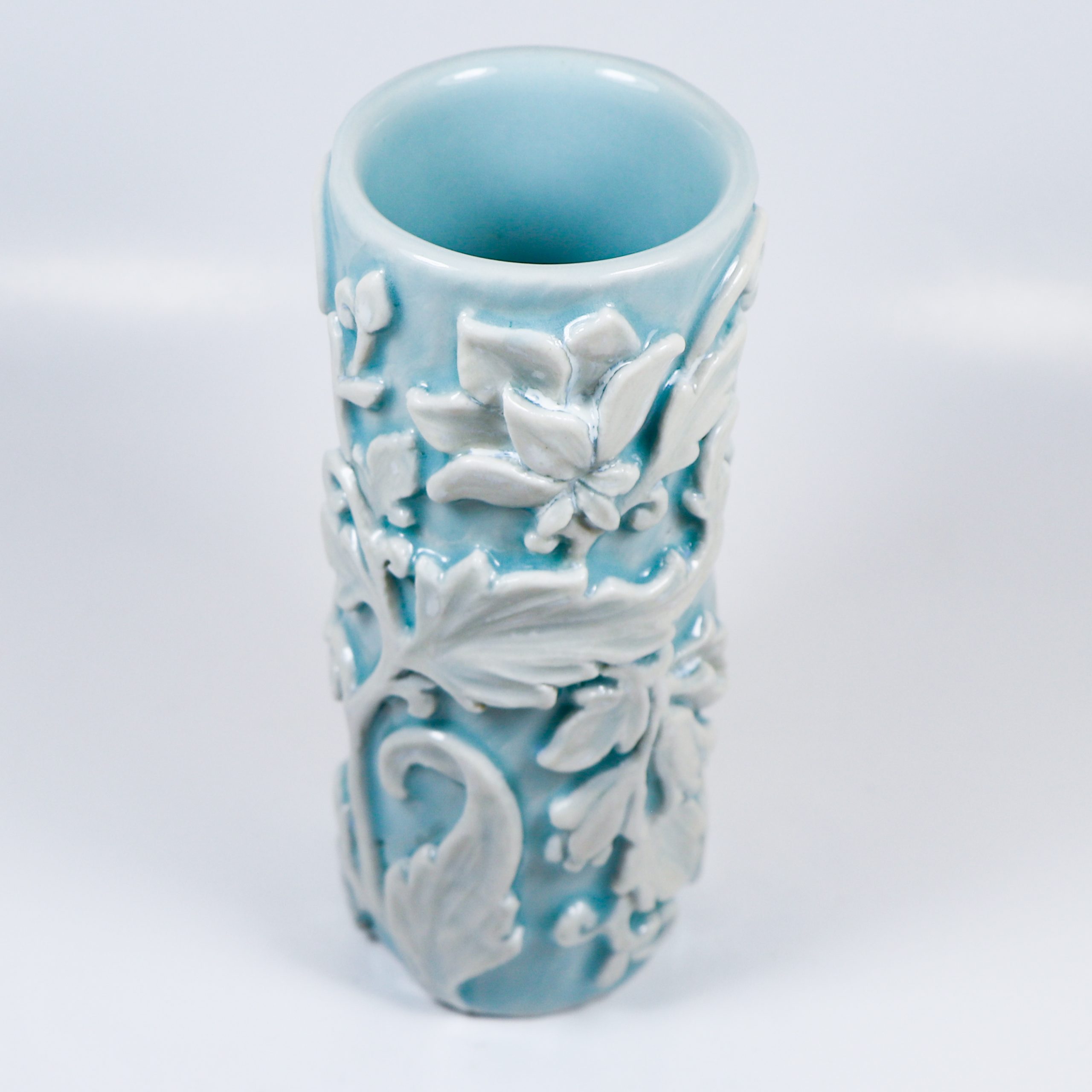 Wheel thrown grolleg porcelain. Hand carved. Cerulean & Micro Pearl glazes. Fired ^6. 5″h x 2″w