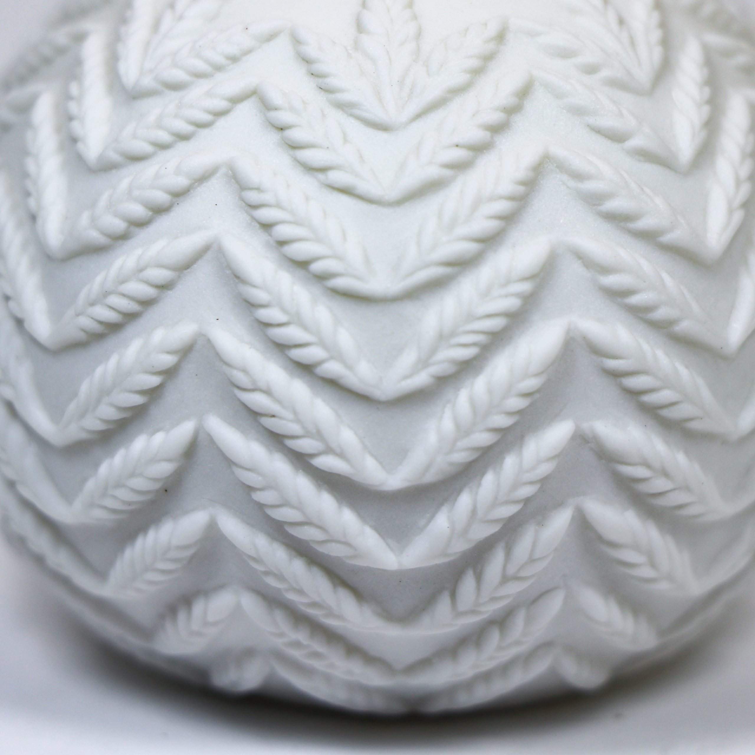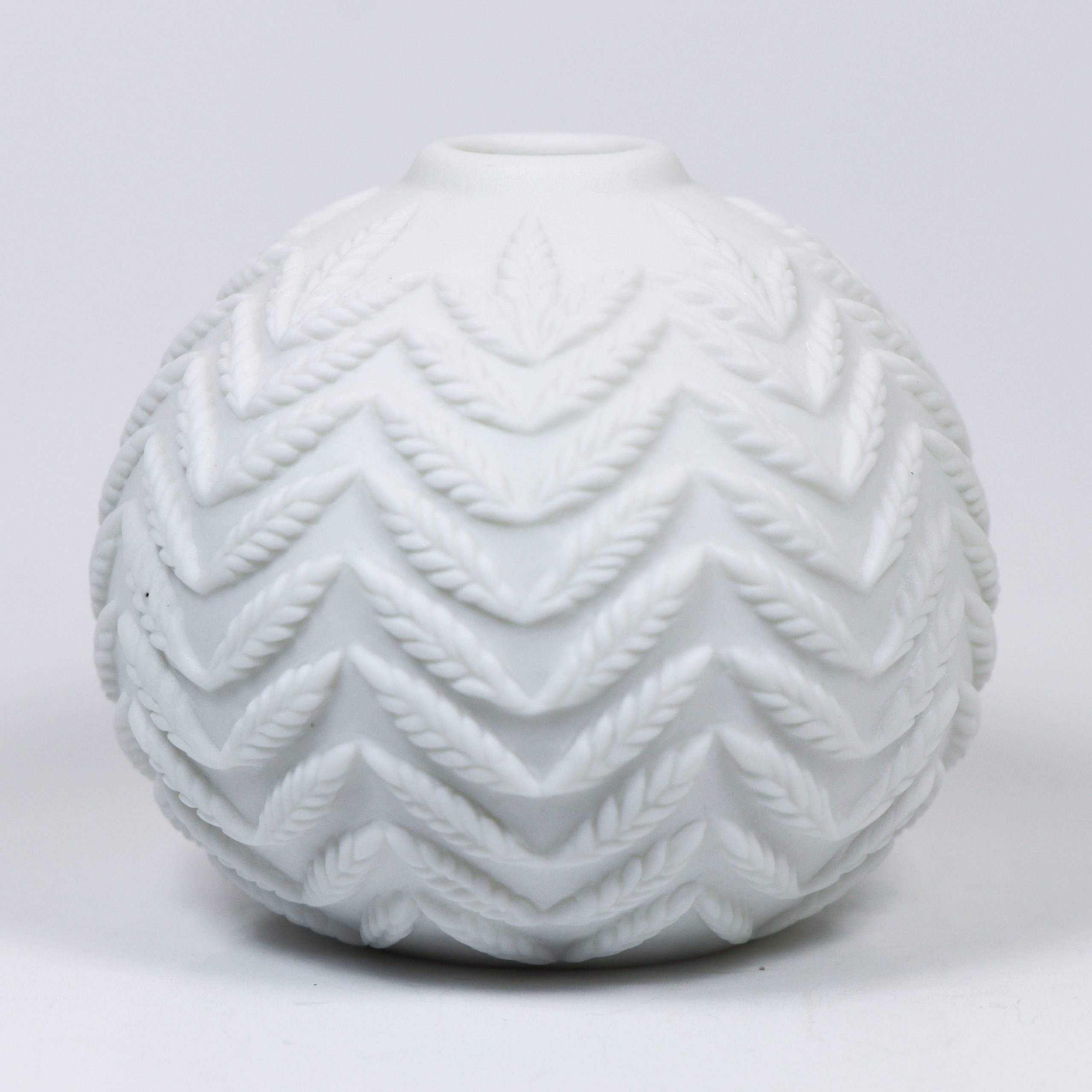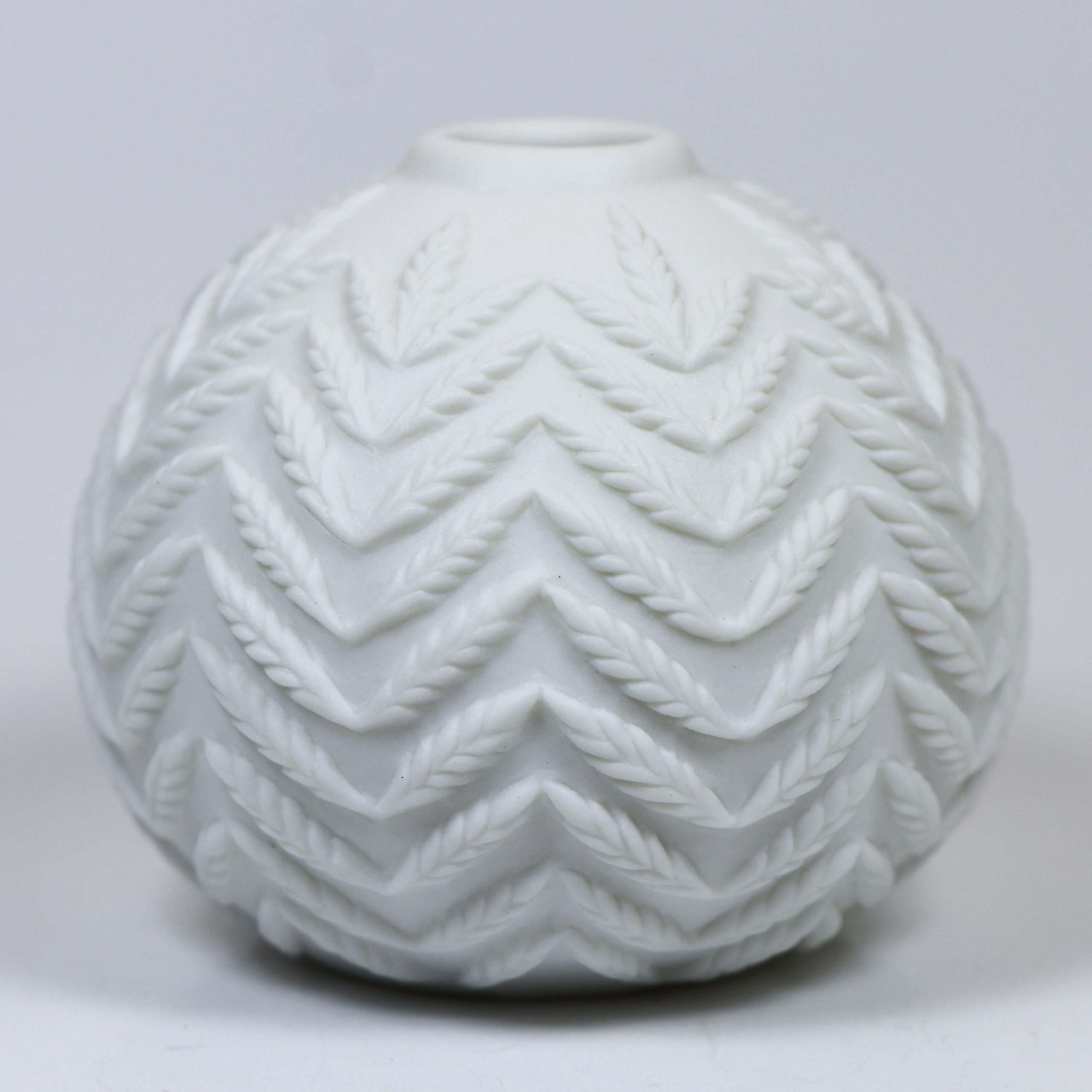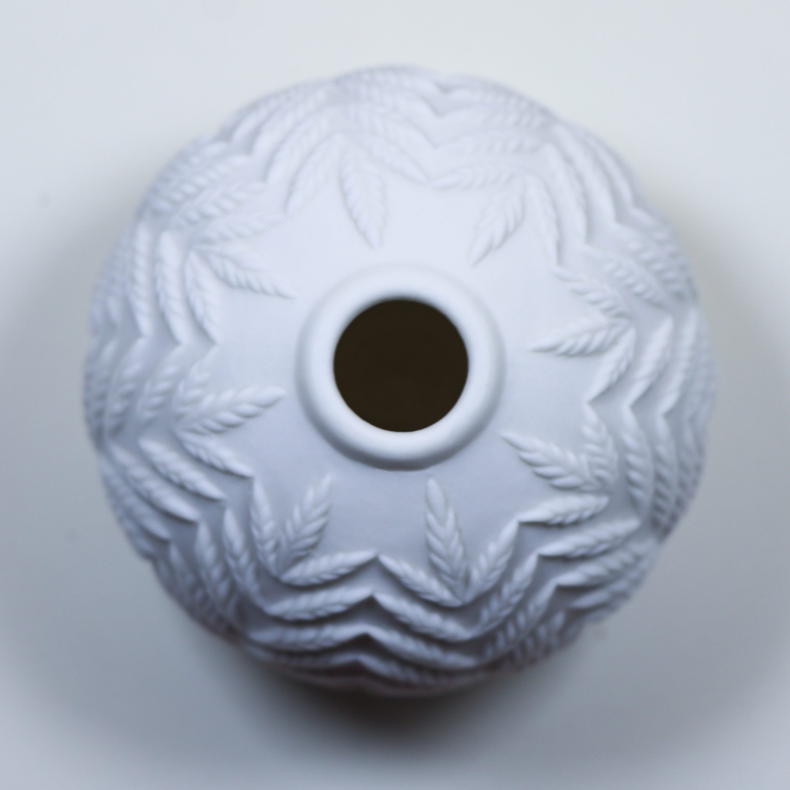 Southern Ice Porcelain. Wheel thrown and hand carved. Fired ^10. Unglazed. 2 1/8″h x 2 1/2″w