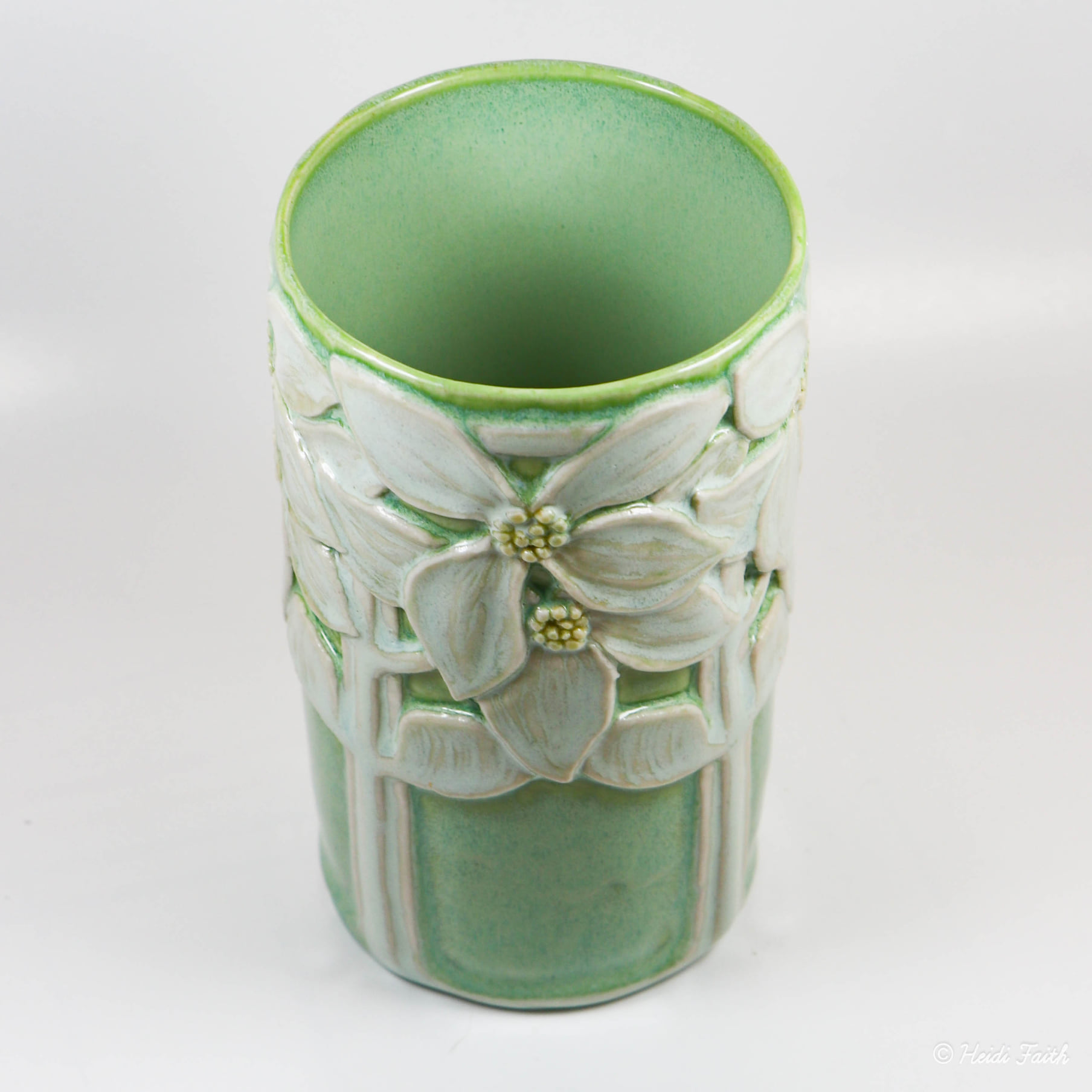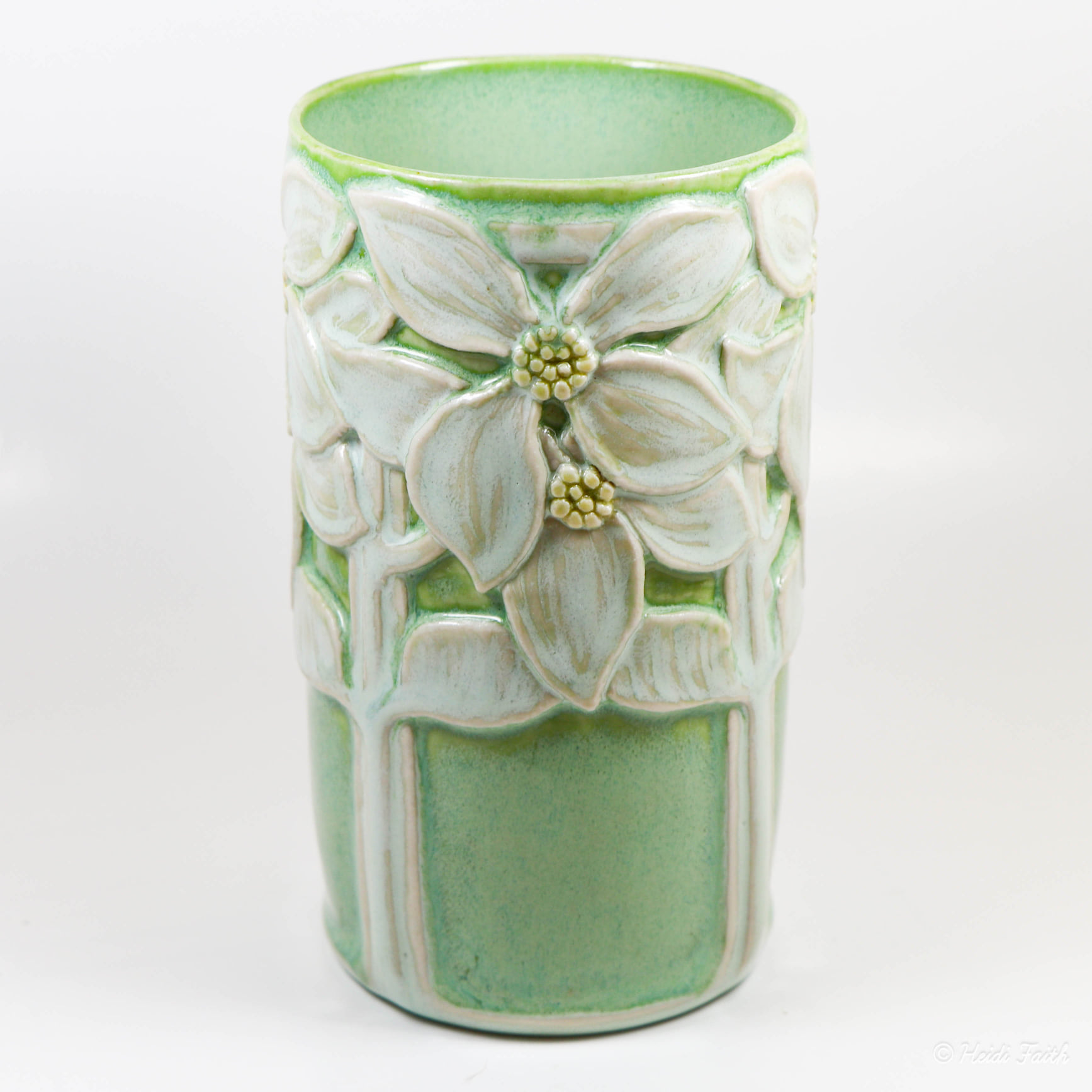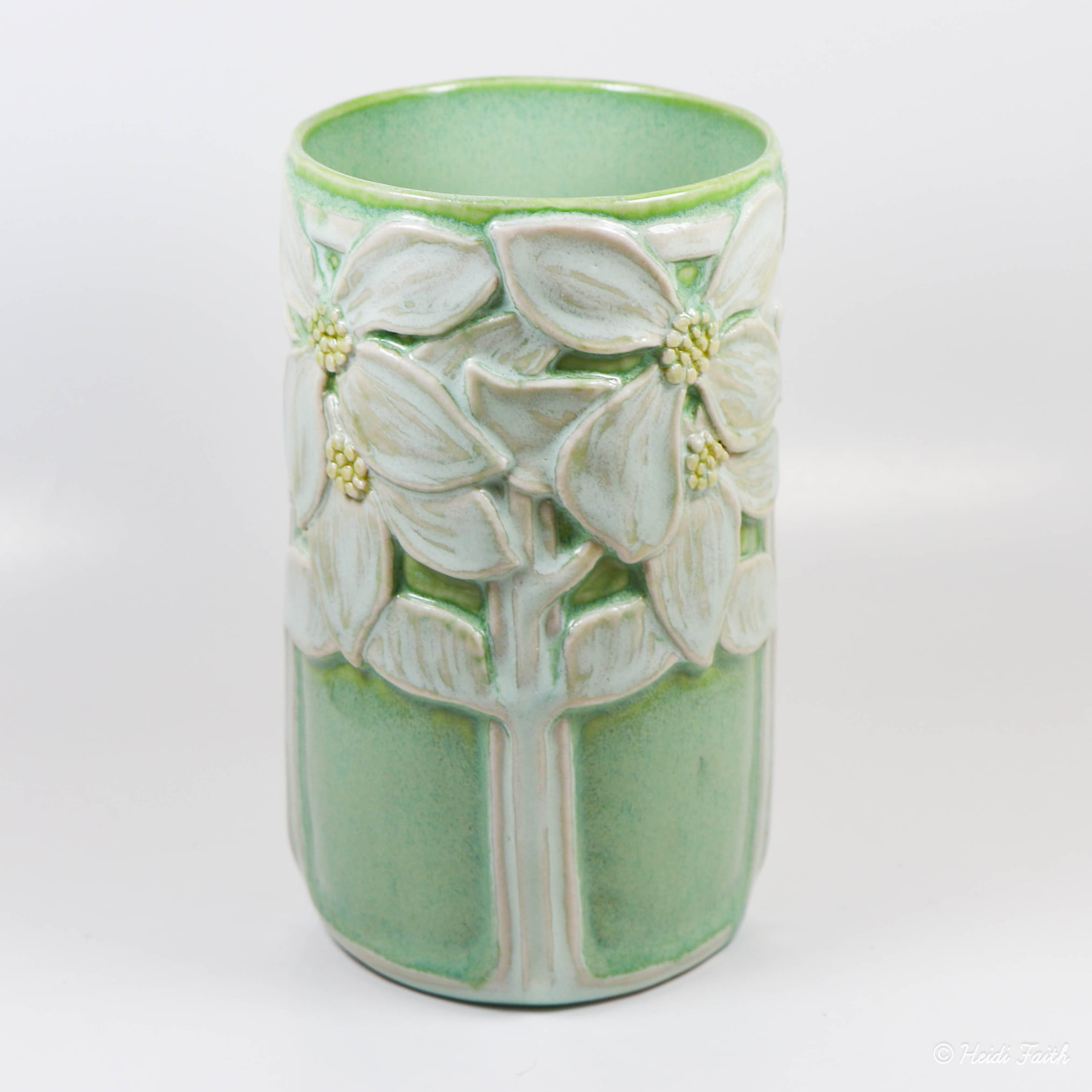 Floral Vase Wheelthrown Babu porcelain. Handcarved. Interior: Cactus Exterior: Cactus on background. Carving: Celery and Marigold celadon Fired ^6. 5″h x 2 7/8″w