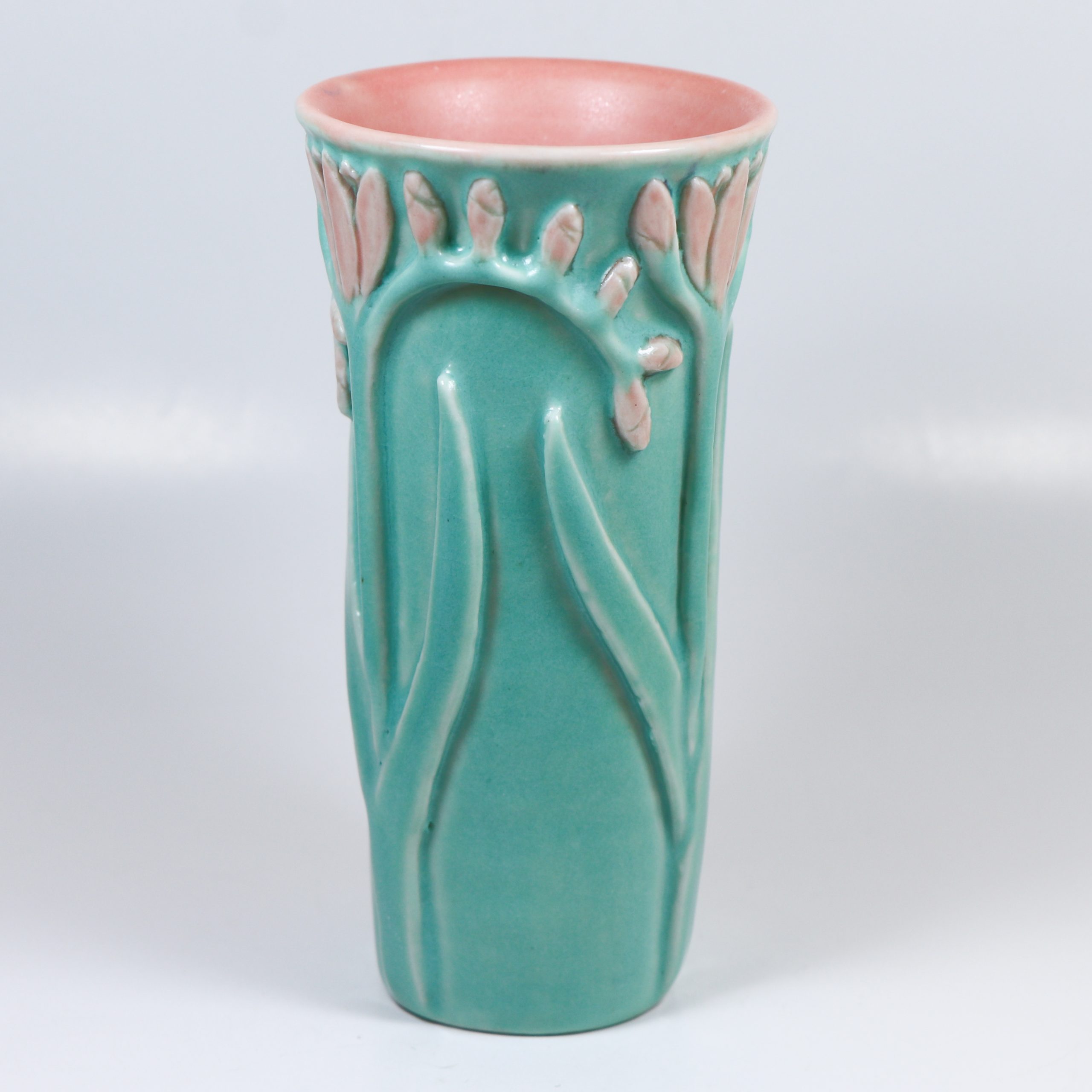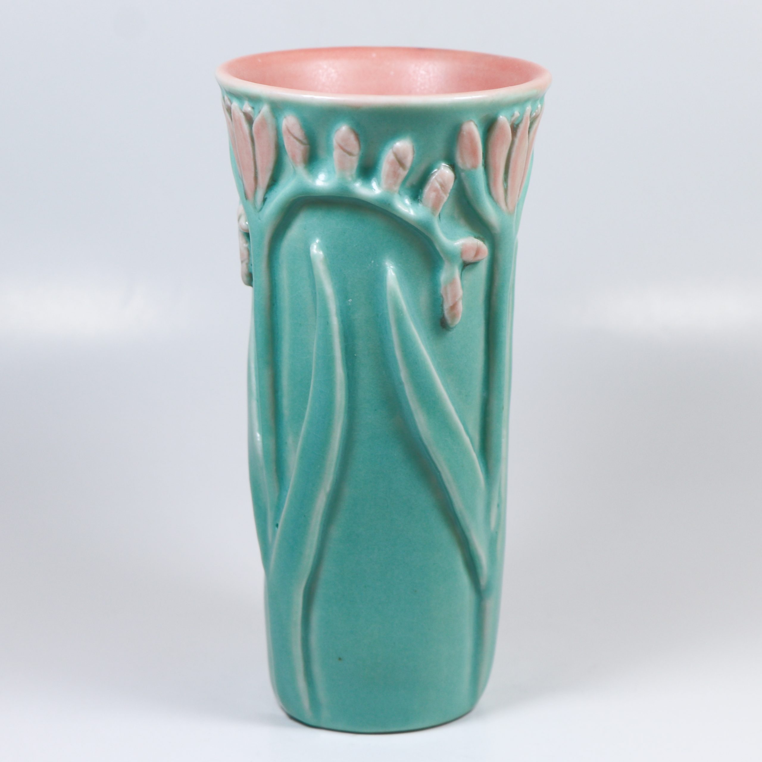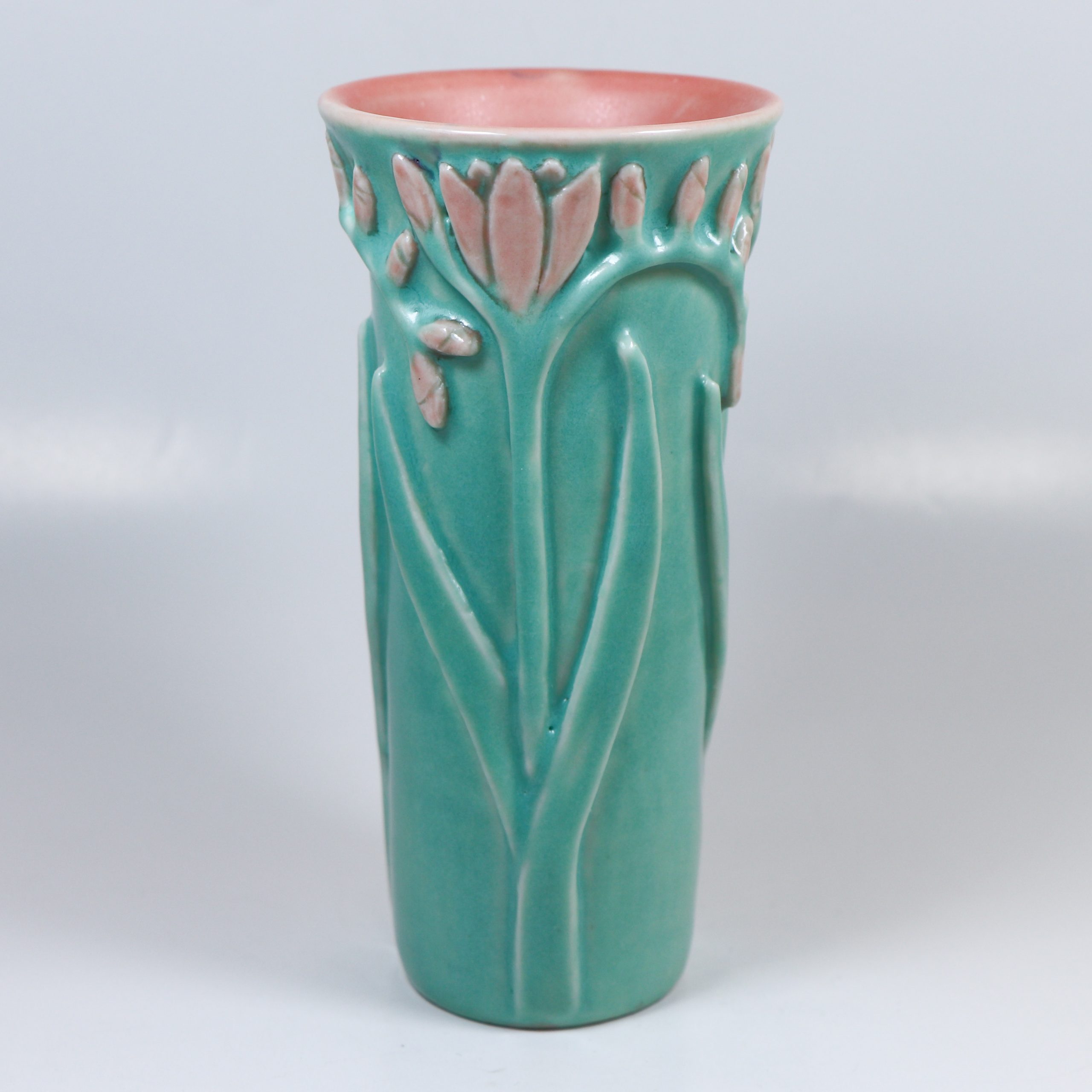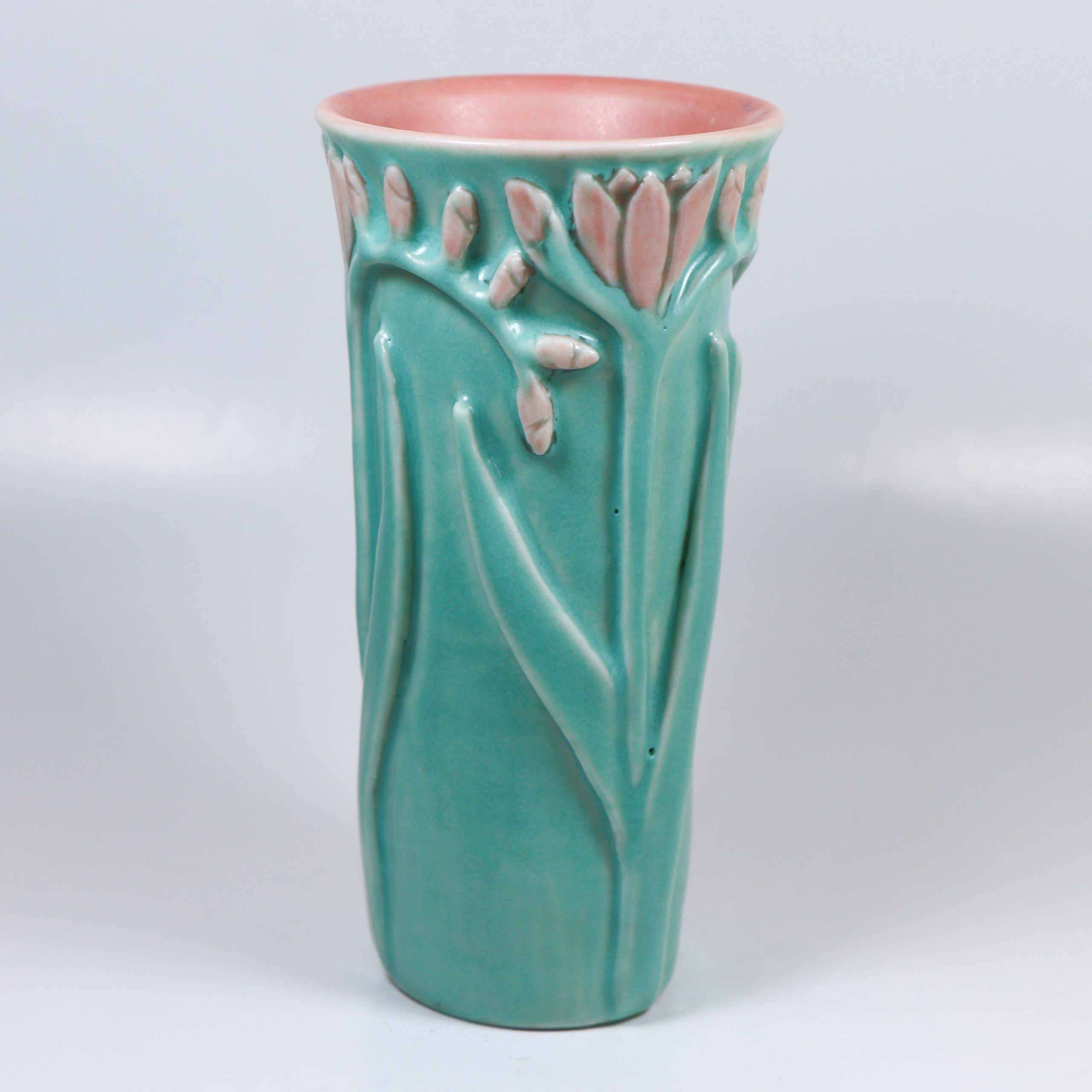 Wheelthrown grolleg porcelain. Handcarved. Pink Matte & Seafoam glazes Fired ^6. 5″h x 2 1/2″w