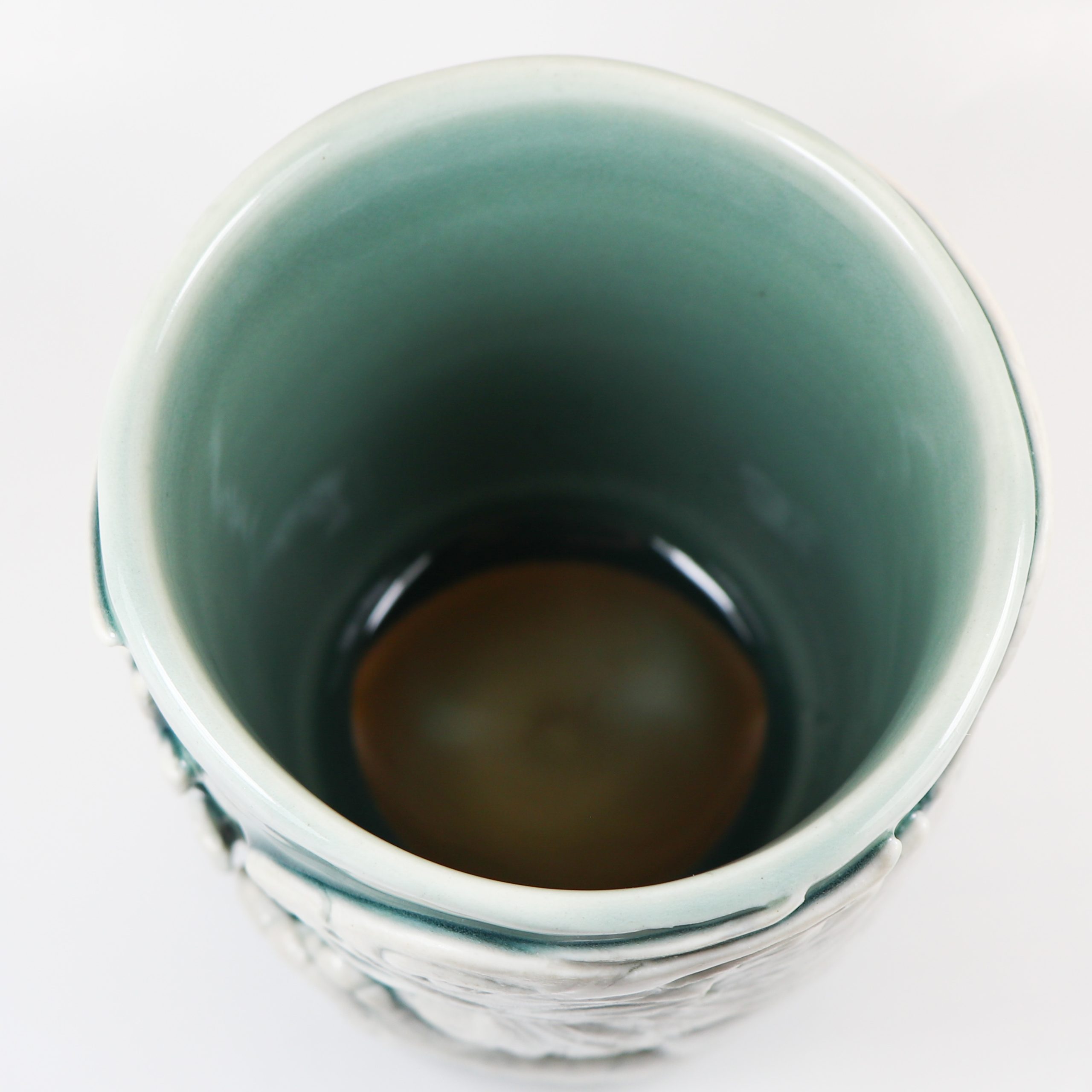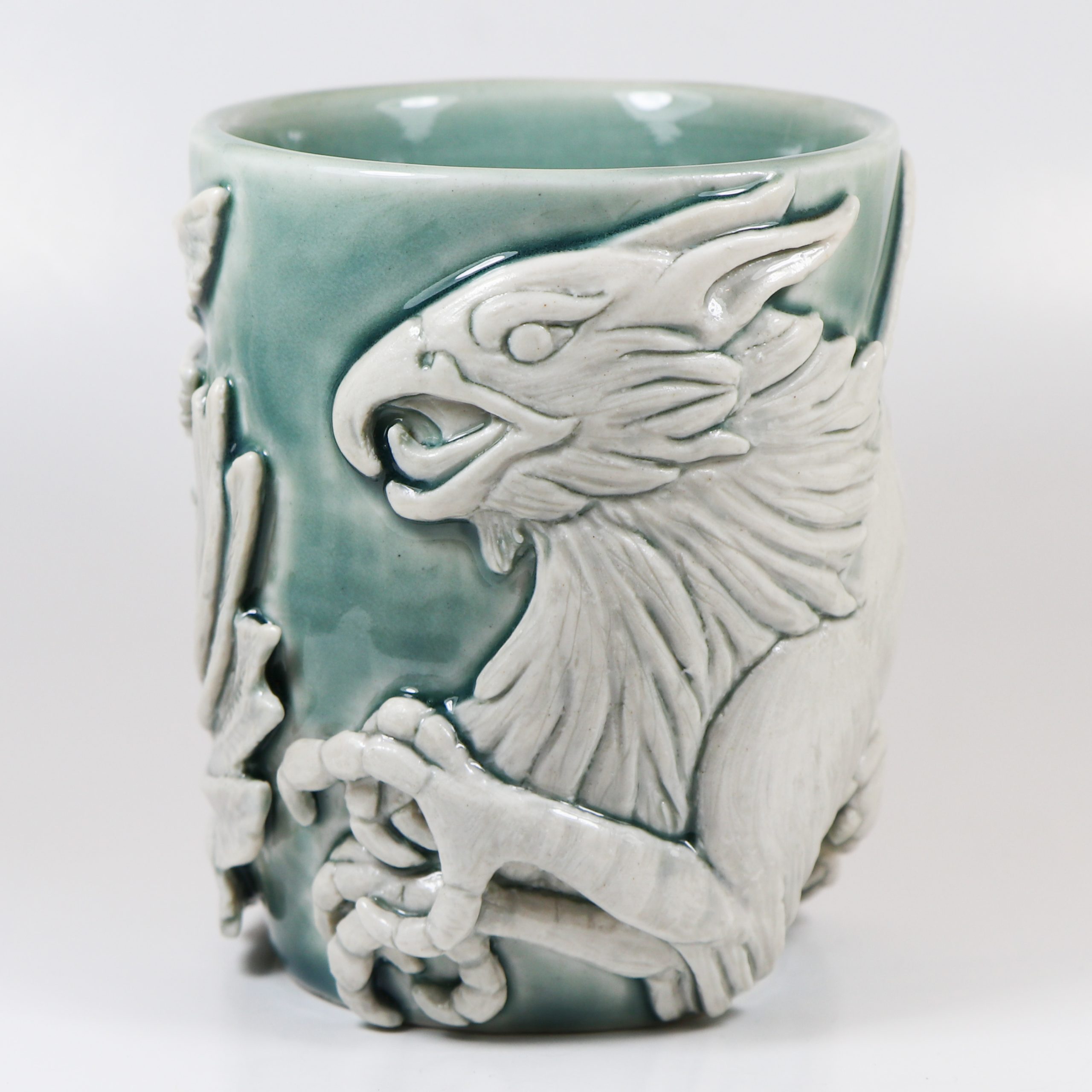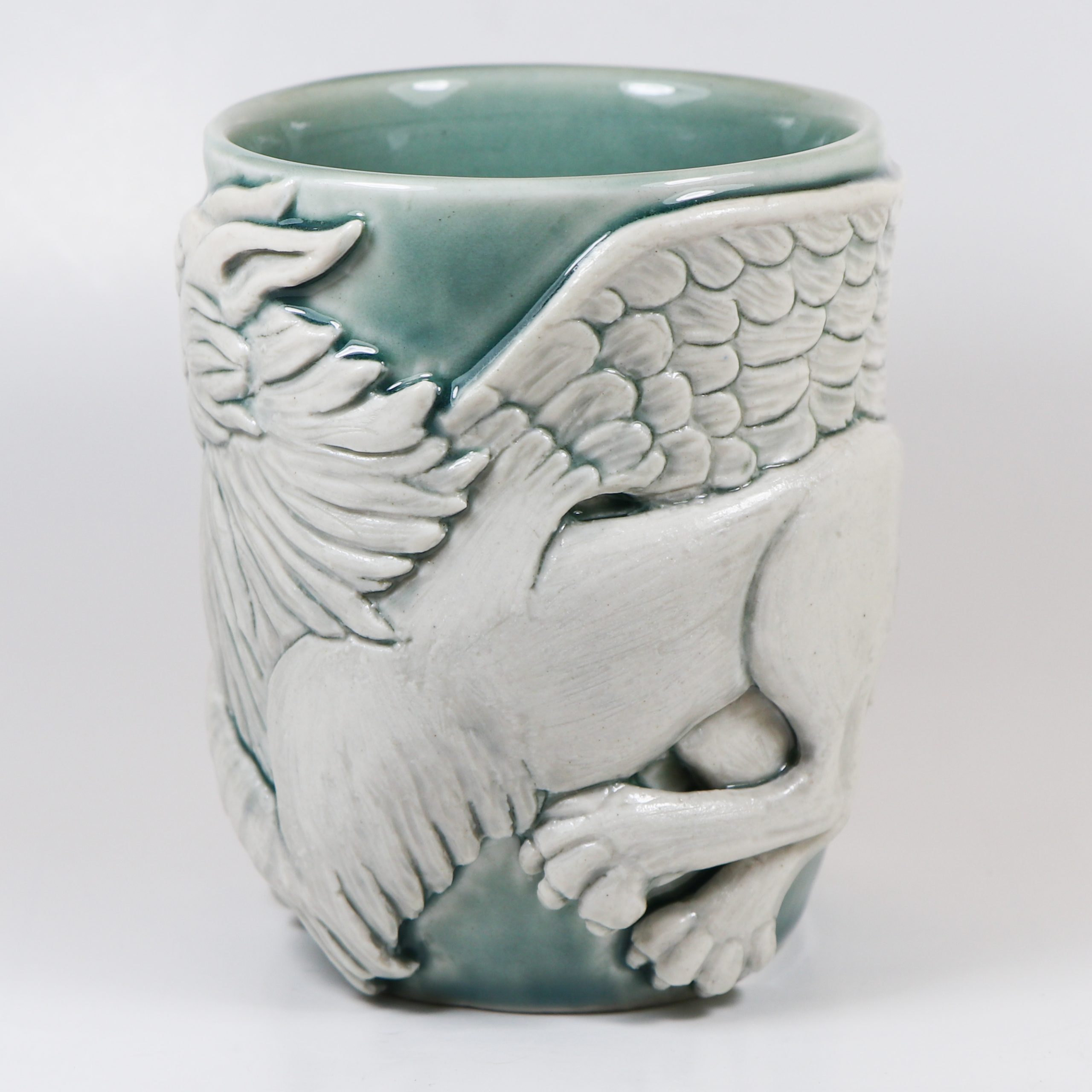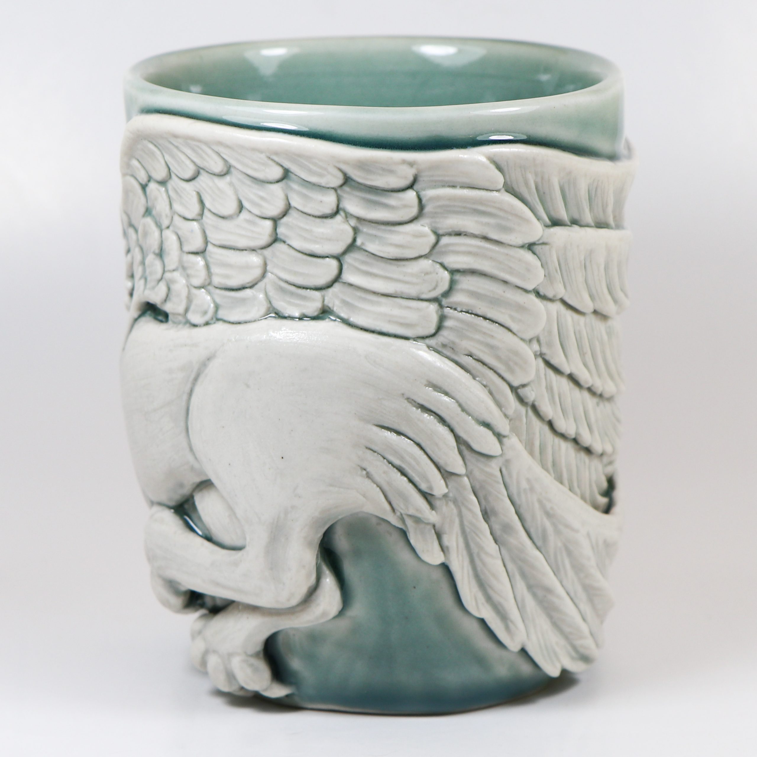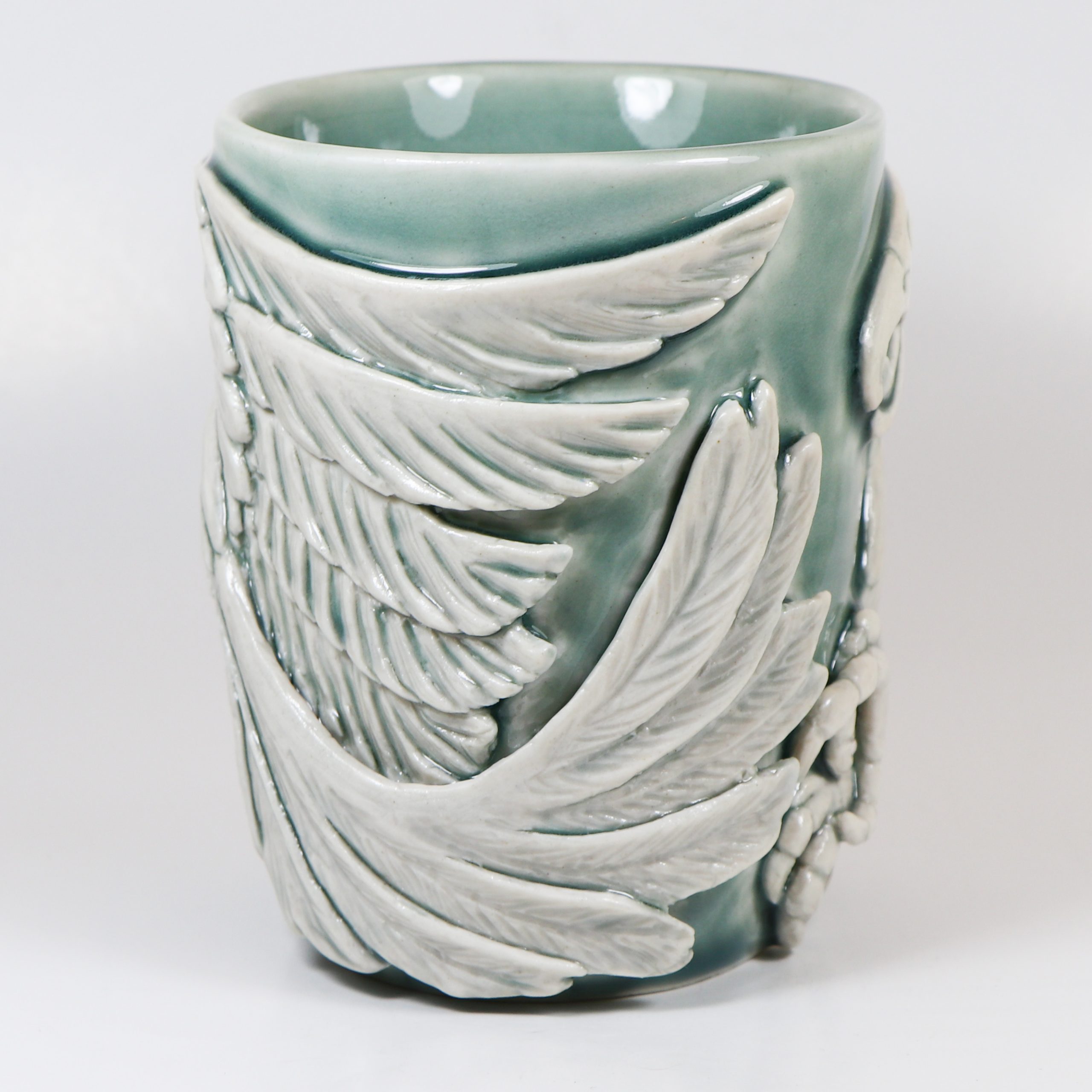 Wheel thrown Babu porcelain. Hand carved. Fog celadon & Eggshell wash. Fired ^10. 4 1/4″h x 3 5/8″w