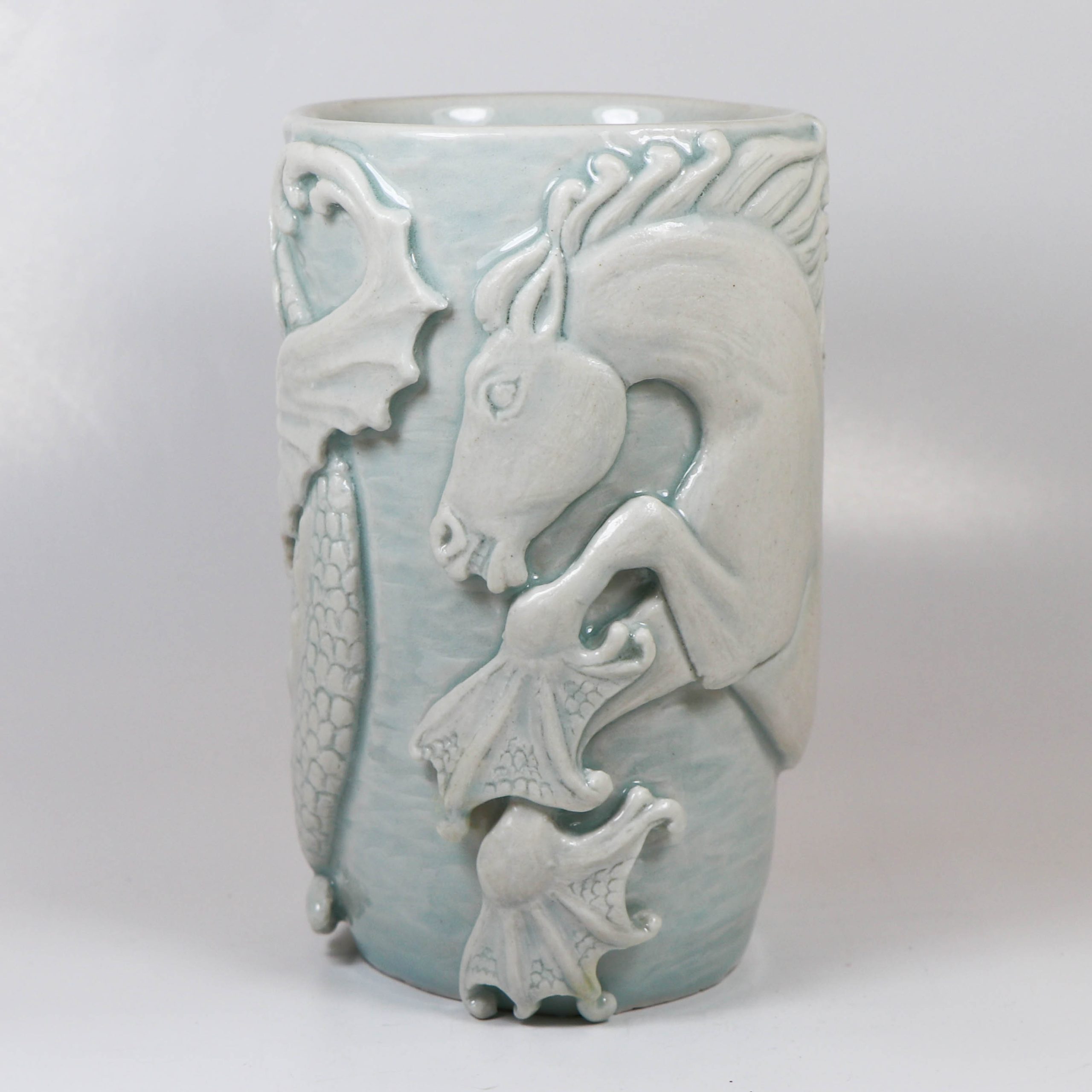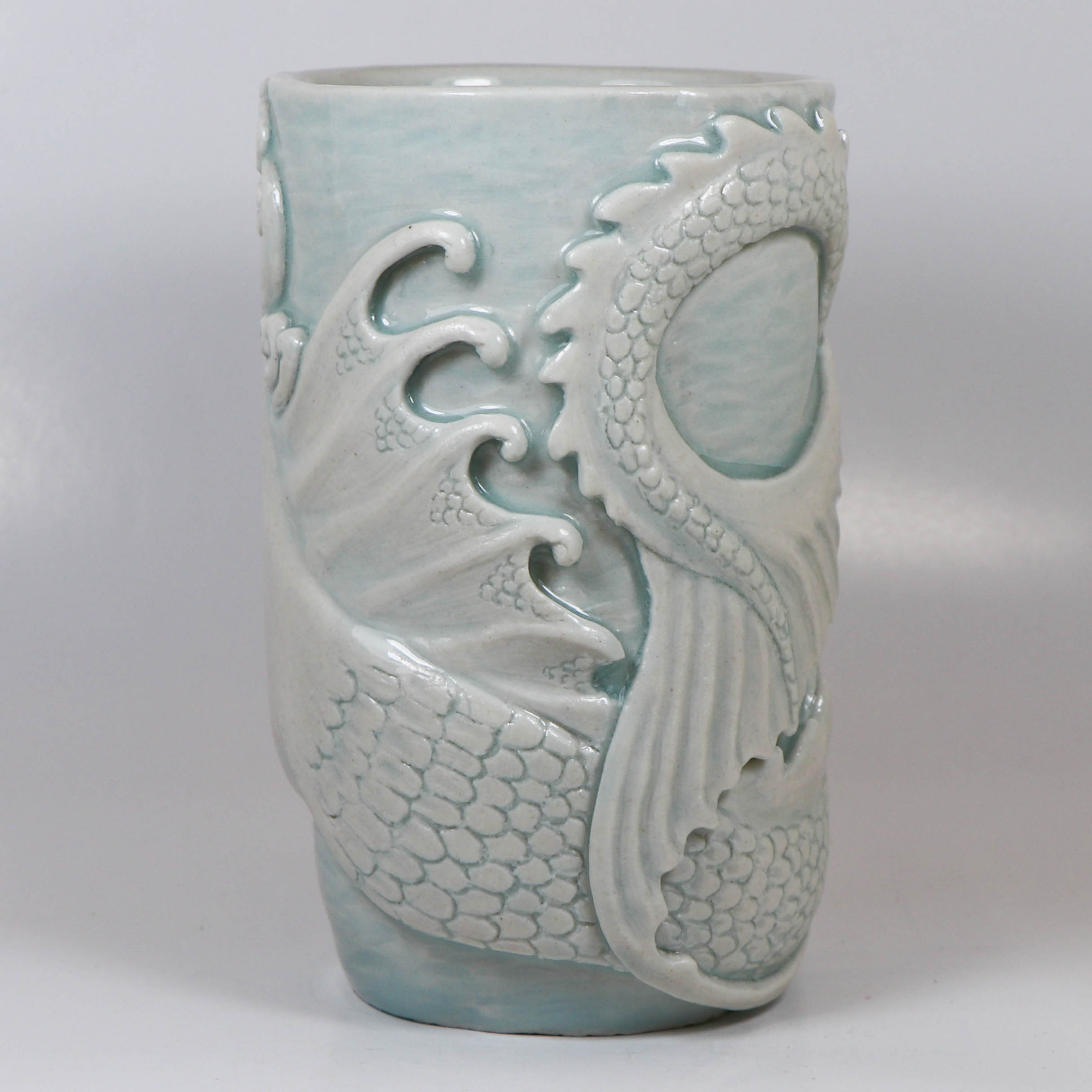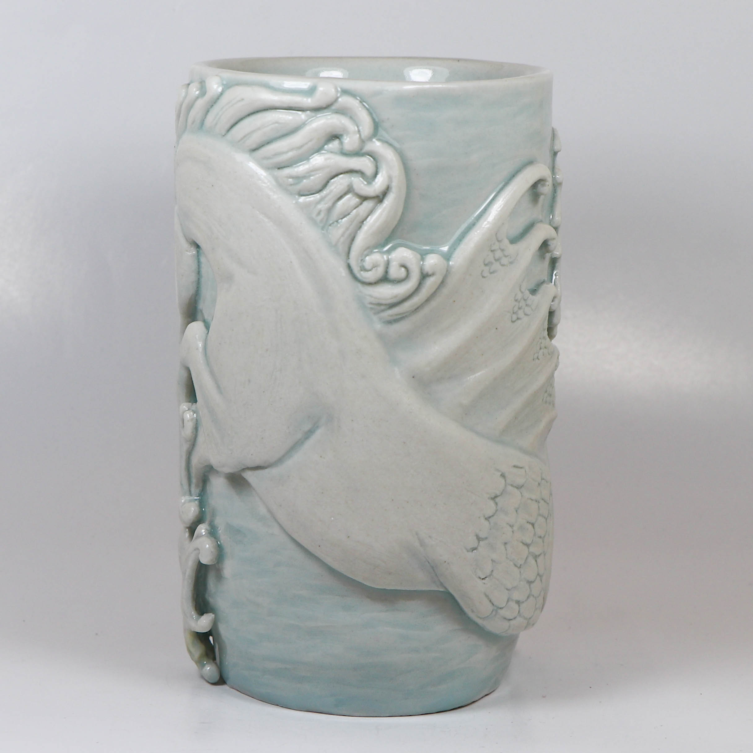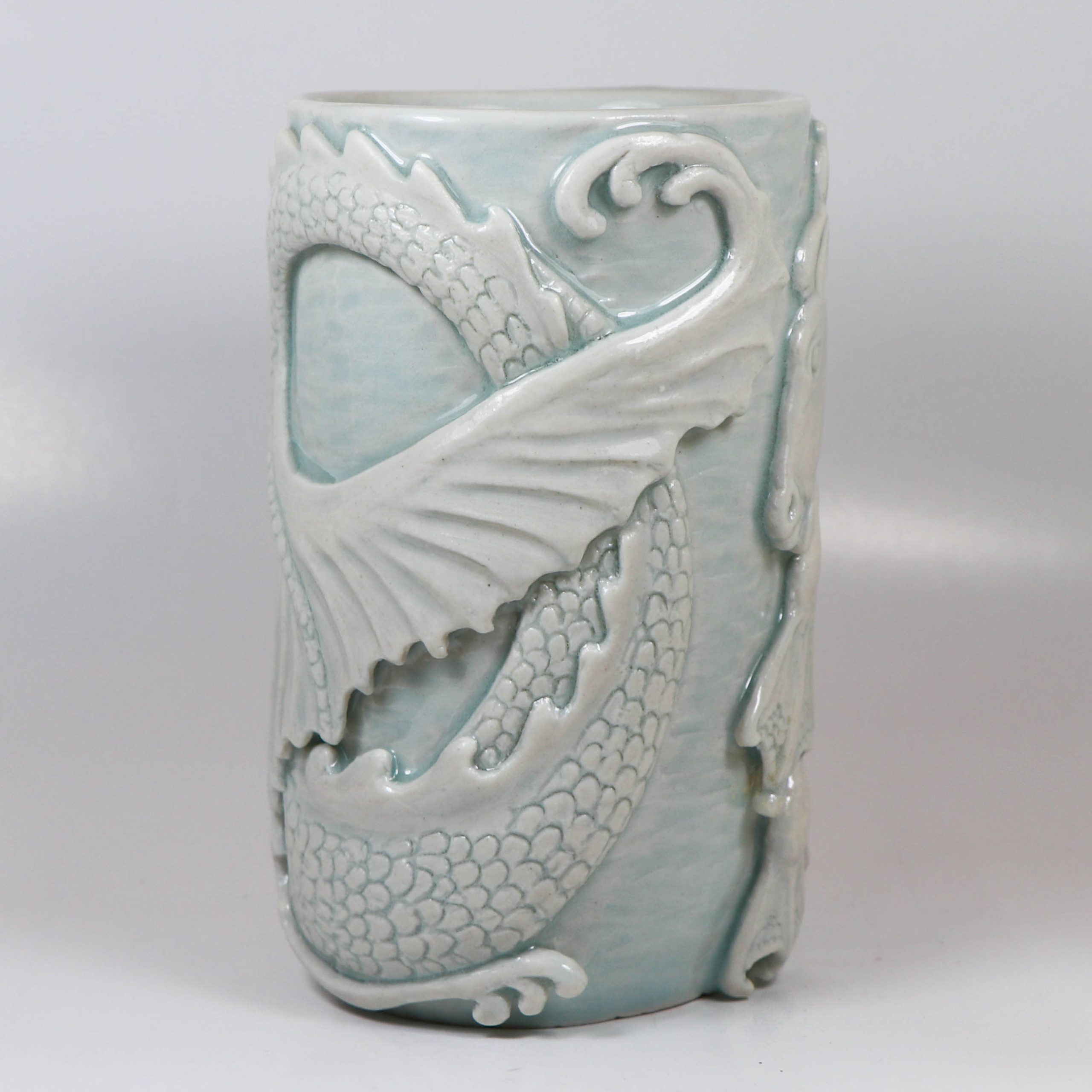 Wheel thrown Babu porcelain. Hand carved. Glacier celadon. Fired ^10. 5″h x 3″w