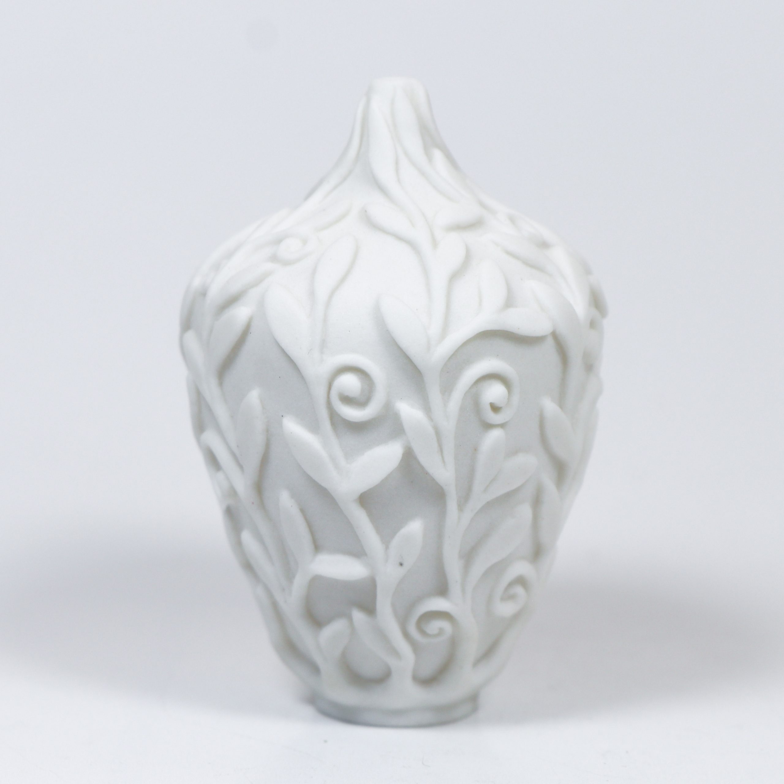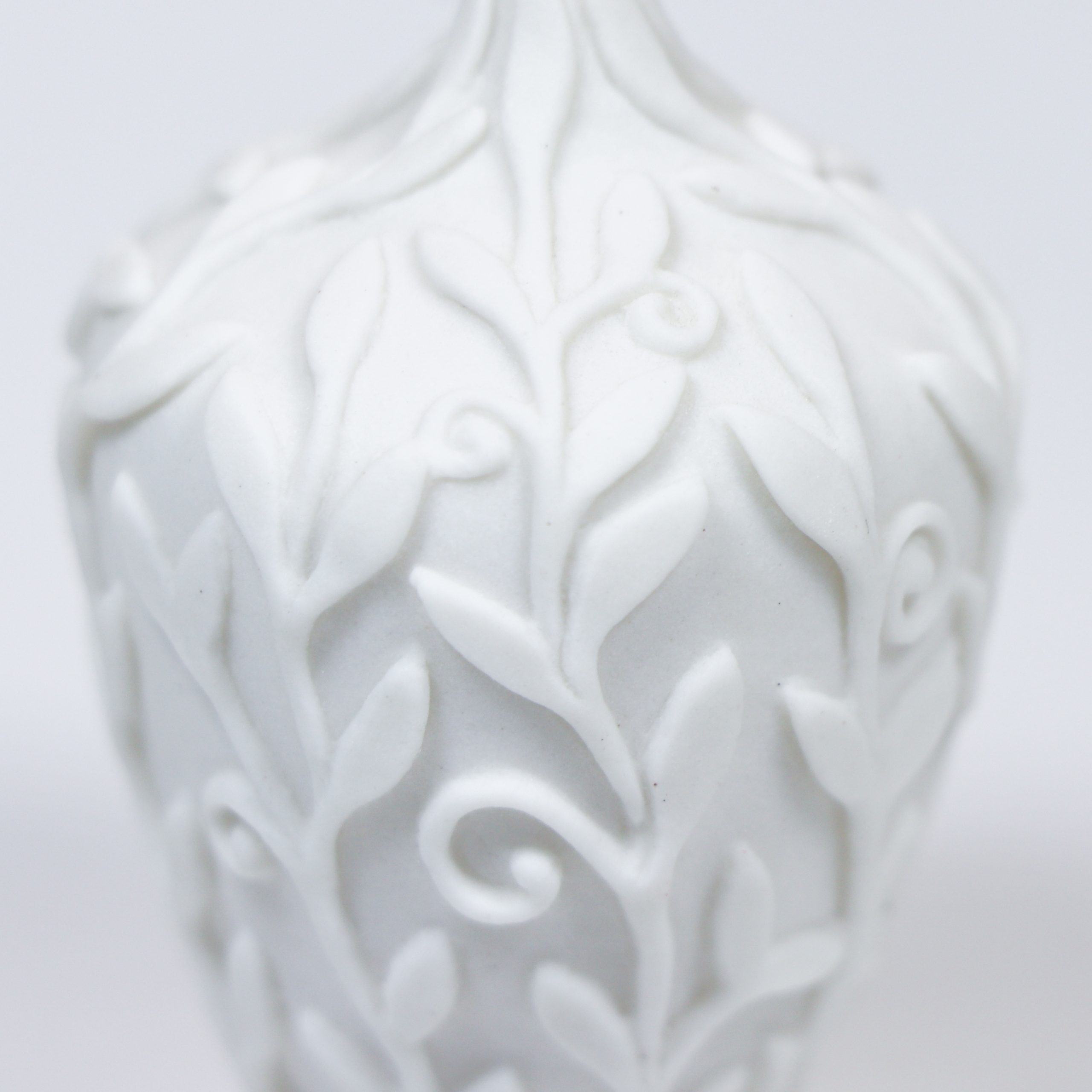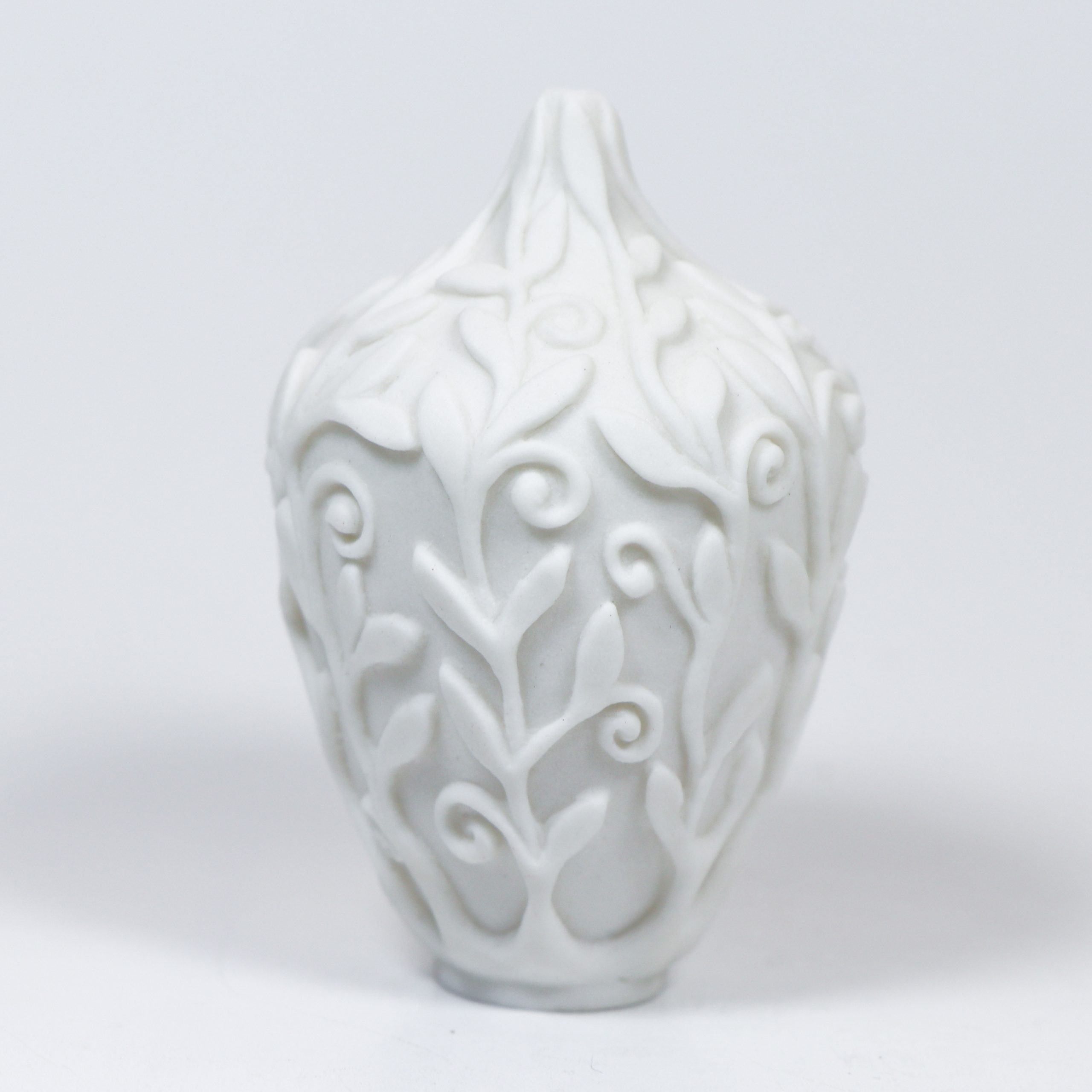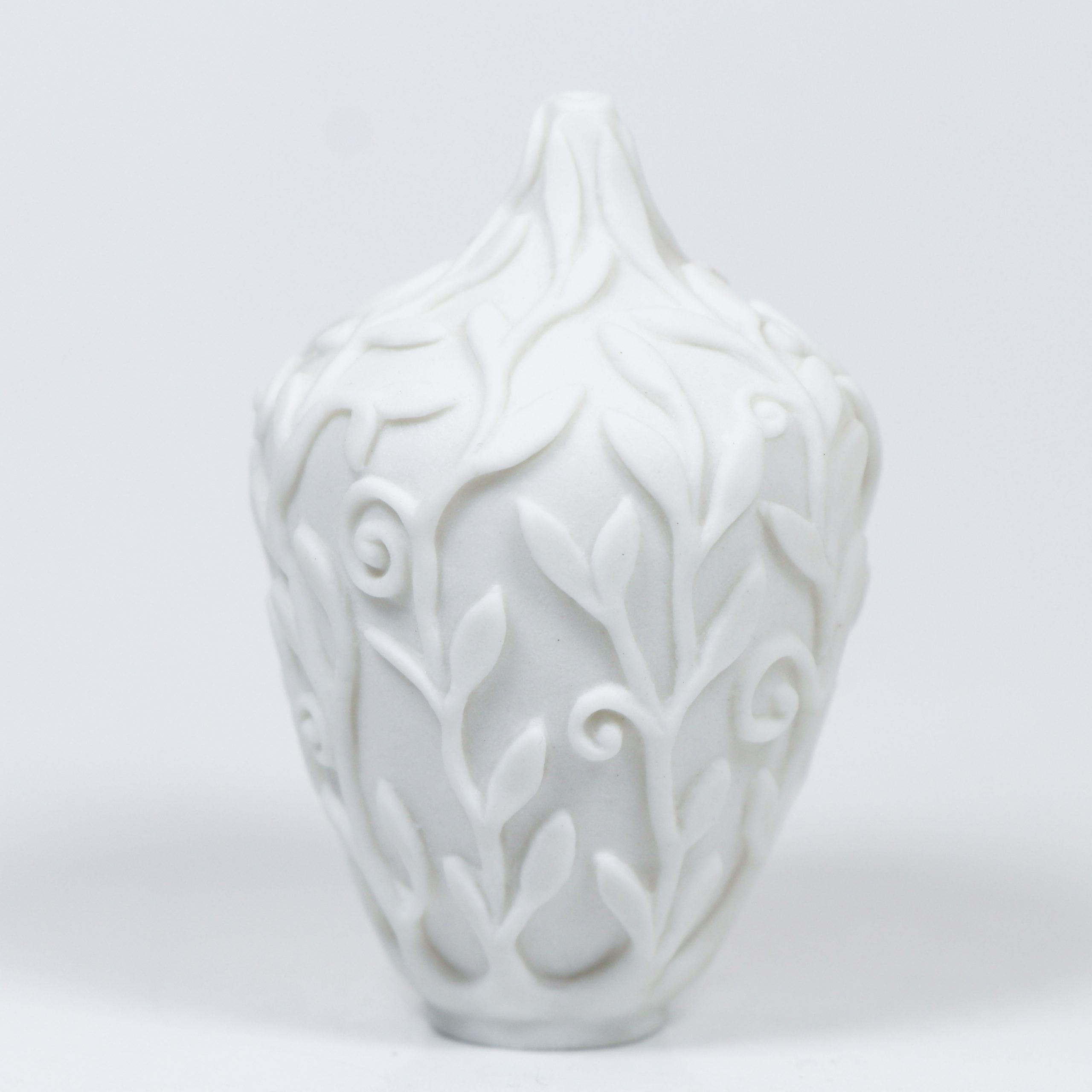 Southern Ice Porcelain. Wheel thrown and hand carved. Fired ^10. Unglazed. 2″h x 1″w