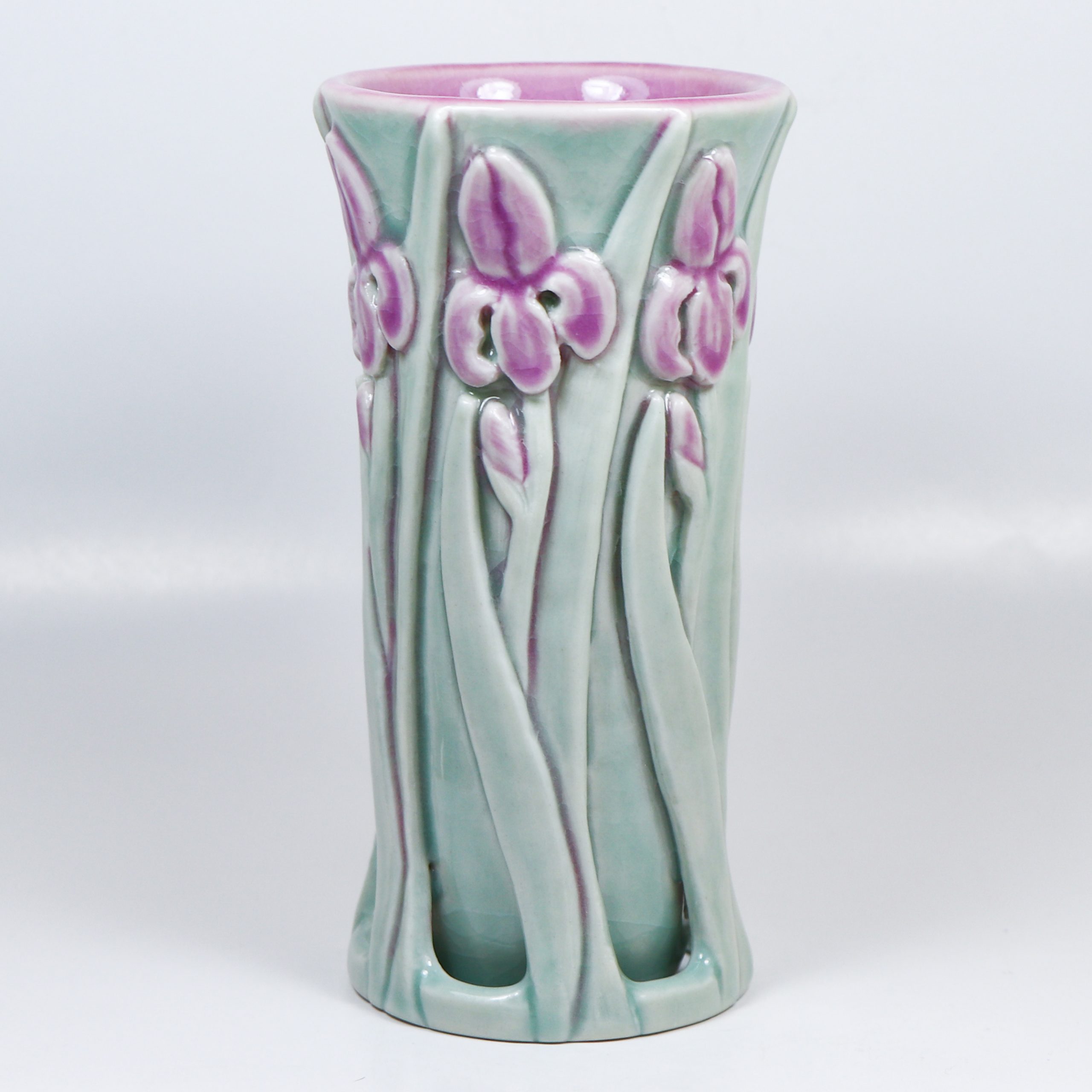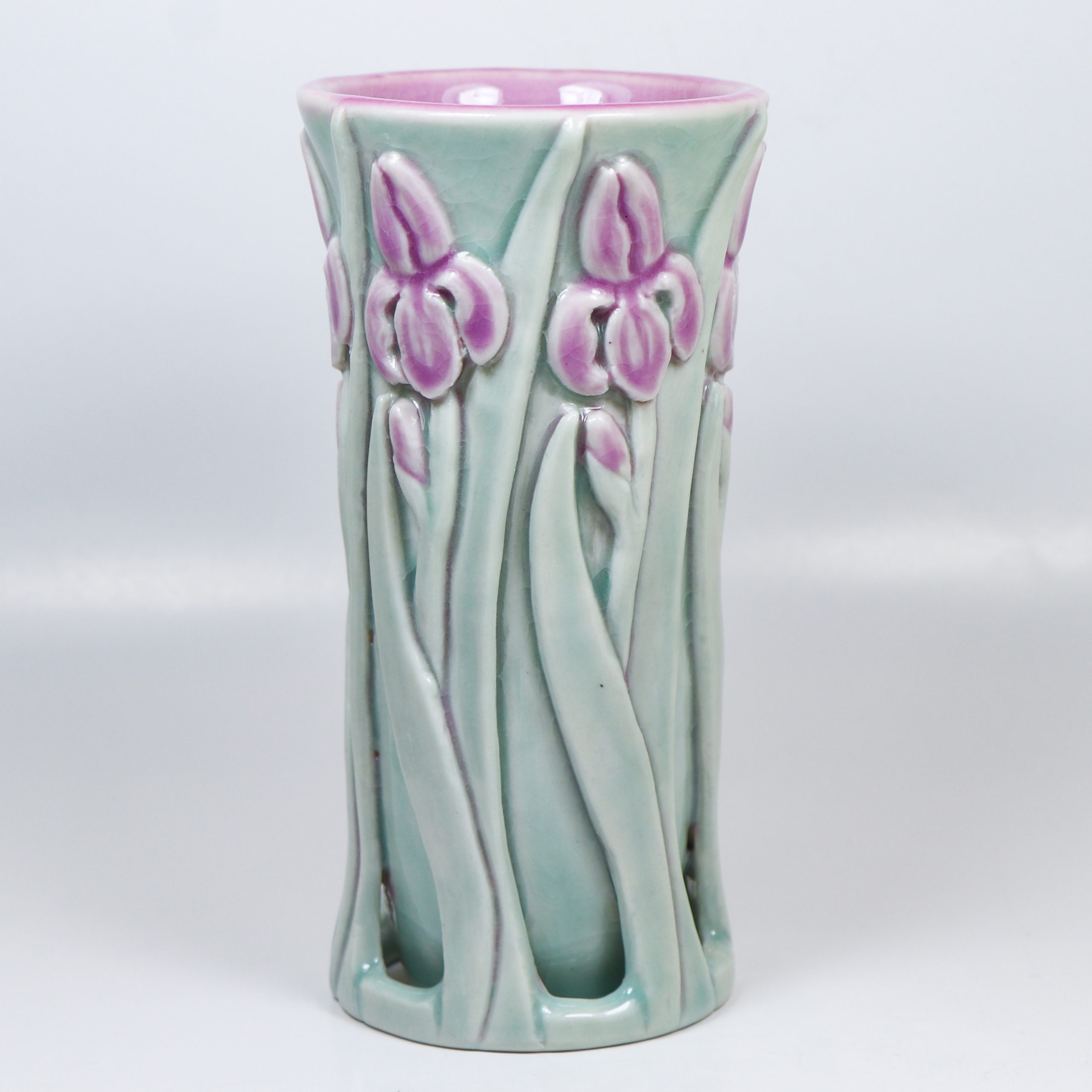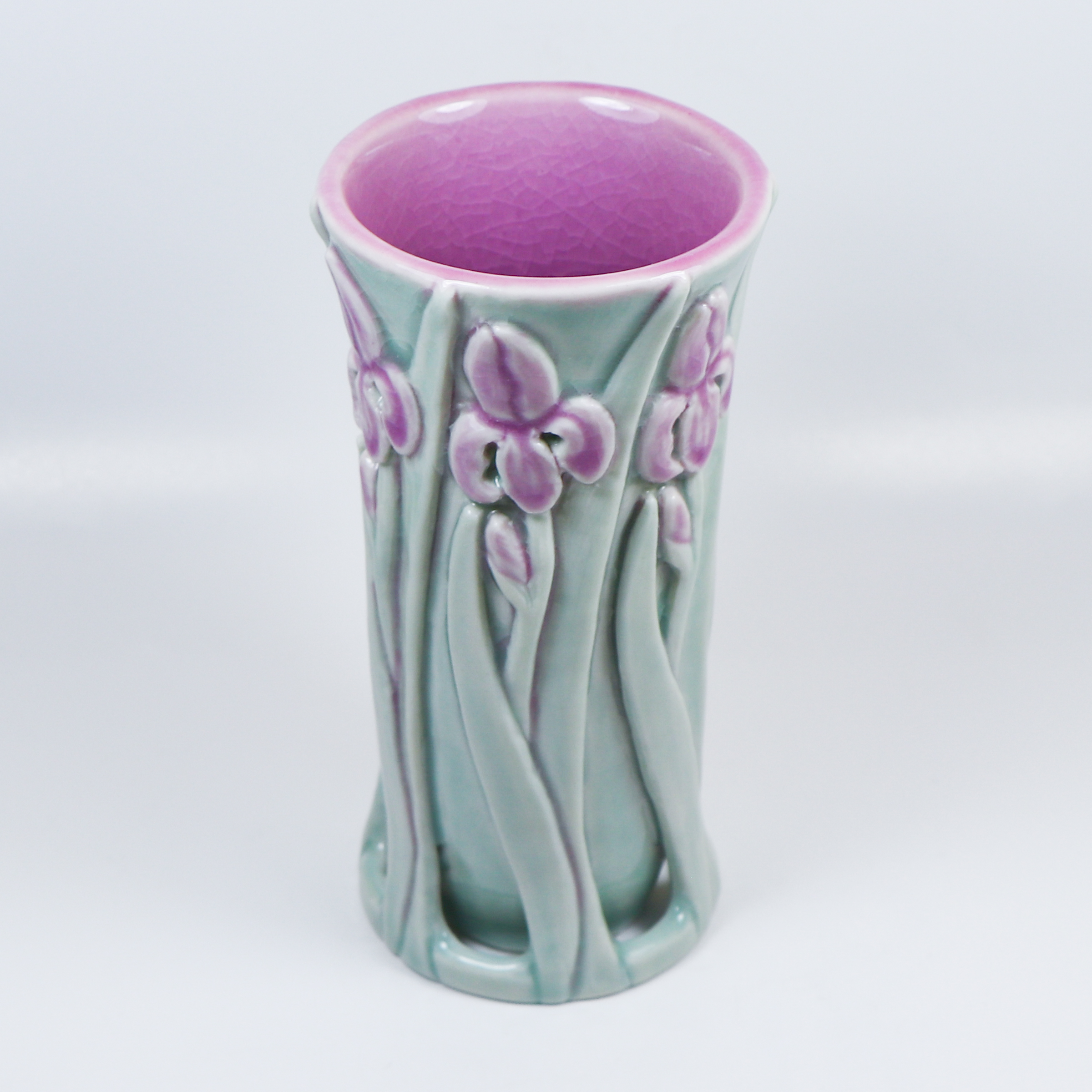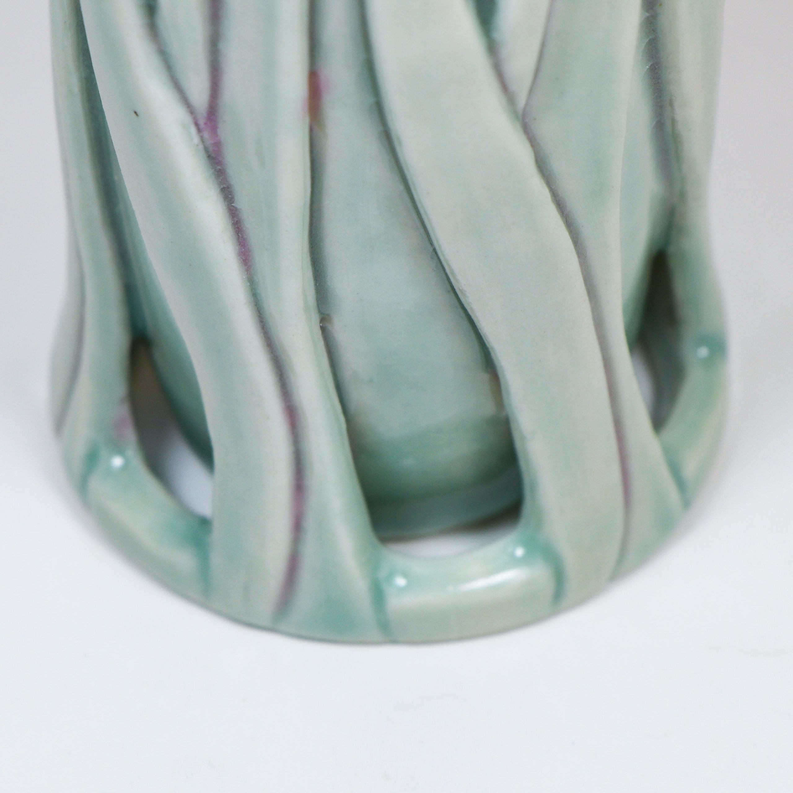 Wheel thrown grolleg porcelain. Hand carved. Aqua & Orchid glazes. Fired ^6. 4 7/8″h x 2 1/4″w