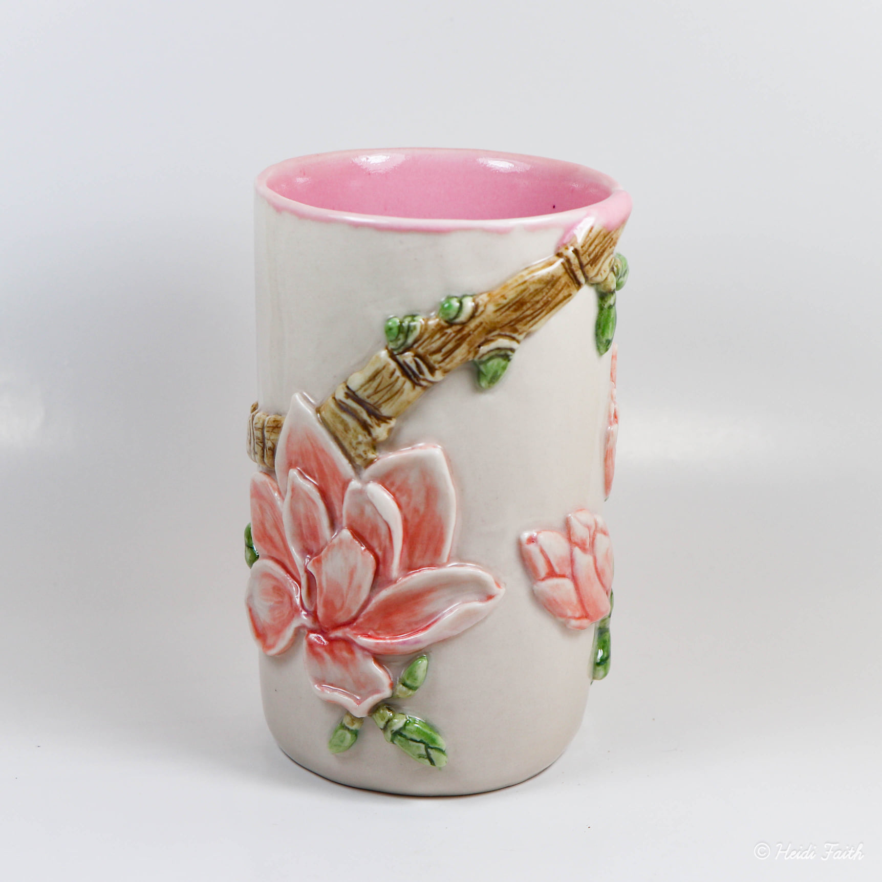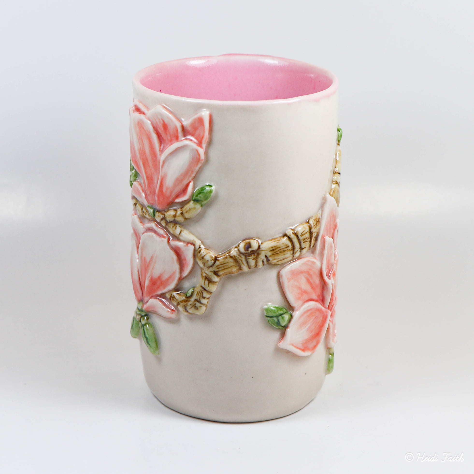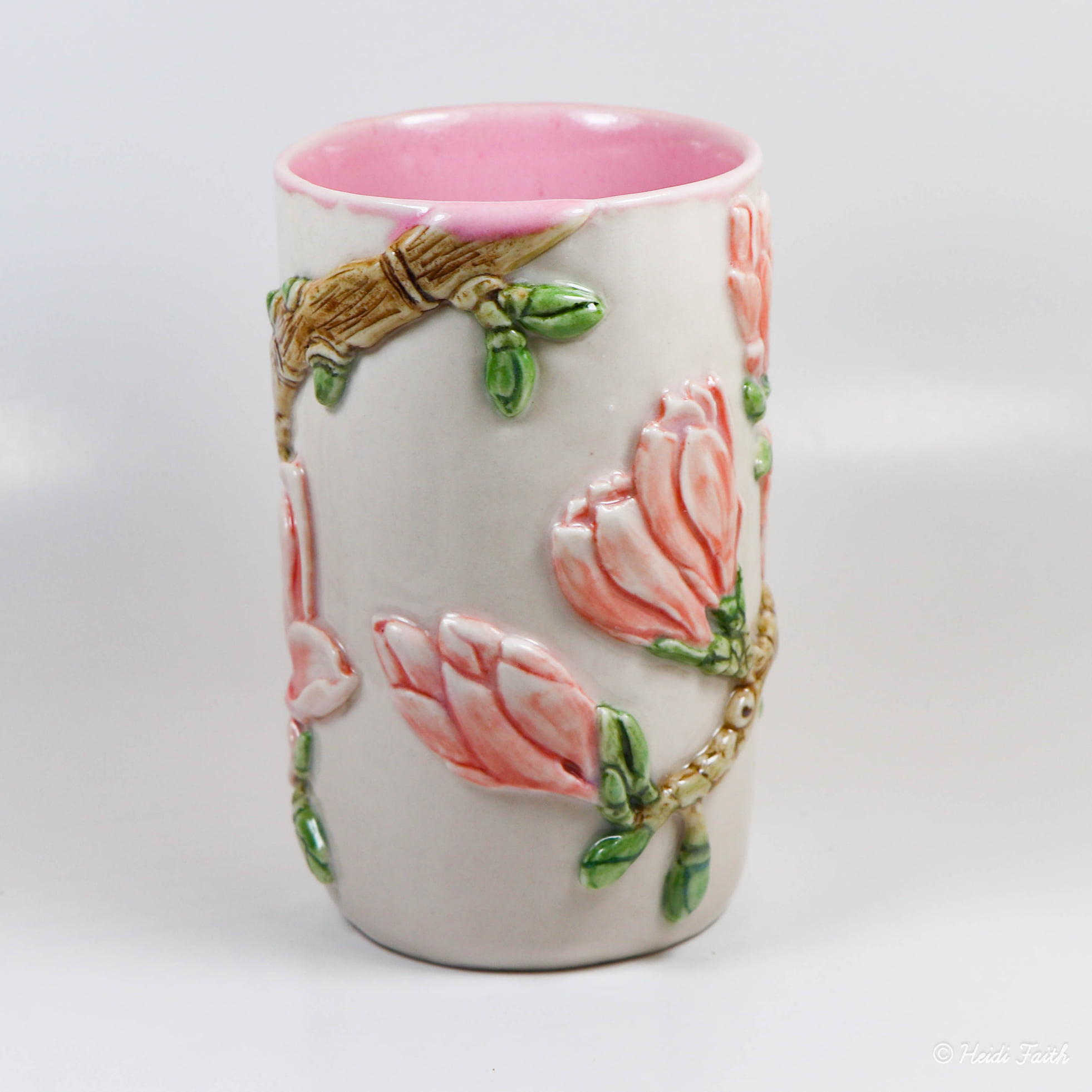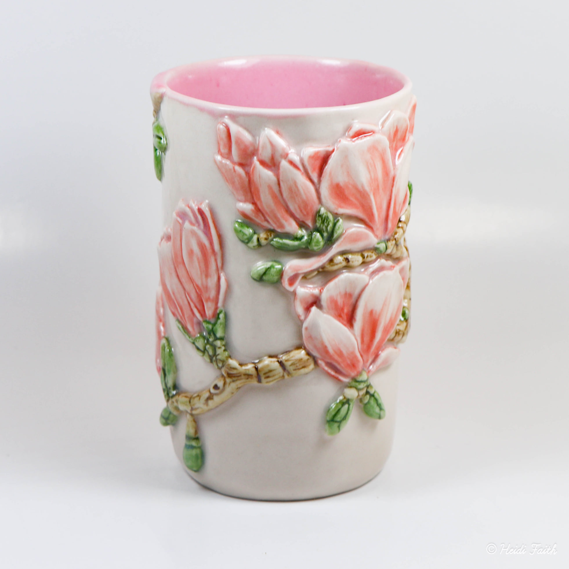 Wheelthrown English porcelain. Handcarved. Interior: Pink Carnation Exterior: Clear over underglaze painting Fired ^5. 4 3/4″h x 3″ w