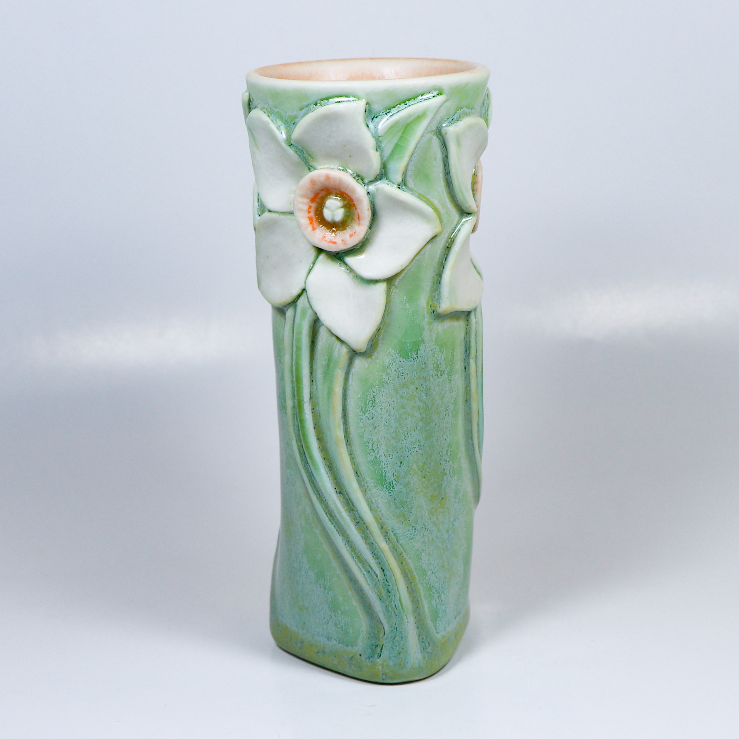 Wheel thrown porcelain. Altered. Hand carved. Wintergreen, Tangerine & Eggshell glazes. Fired ^6. 5 1/8″h x 2″ w