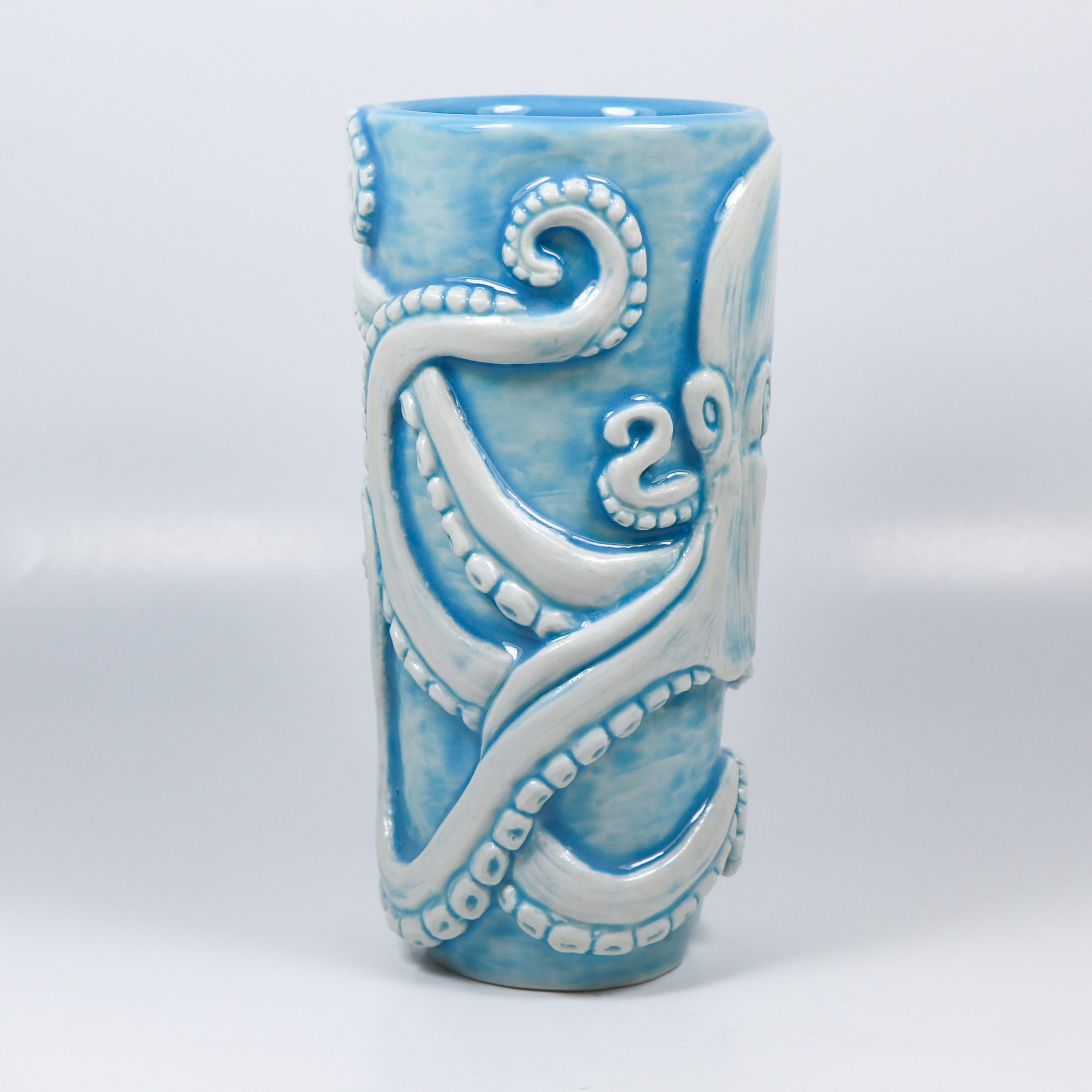 Wheel thrown grolleg porcelain. Hand carved. Mediterranean Sea & Cerulean glazes. Fired ^6. 5 1/8″h x 2 1/2″w
