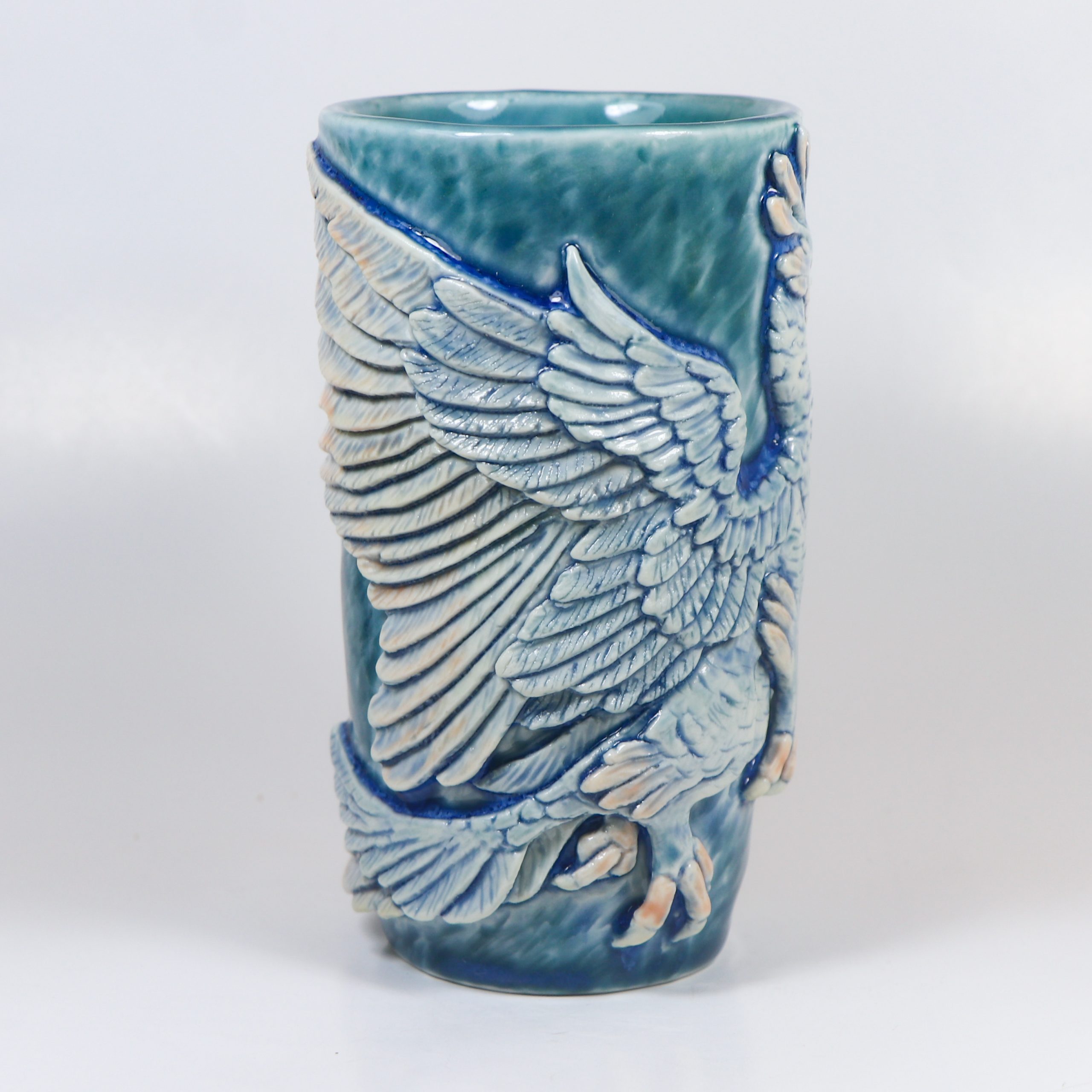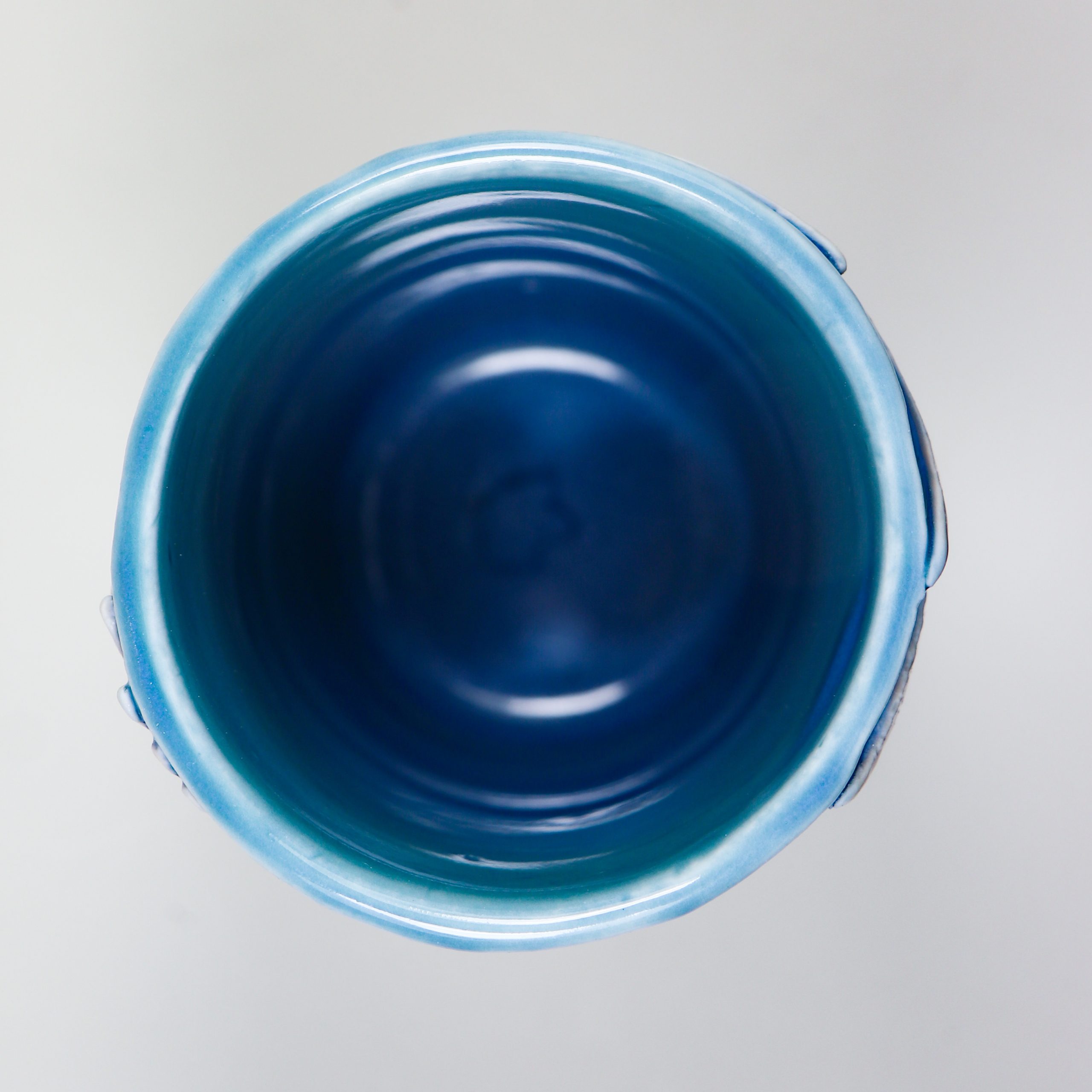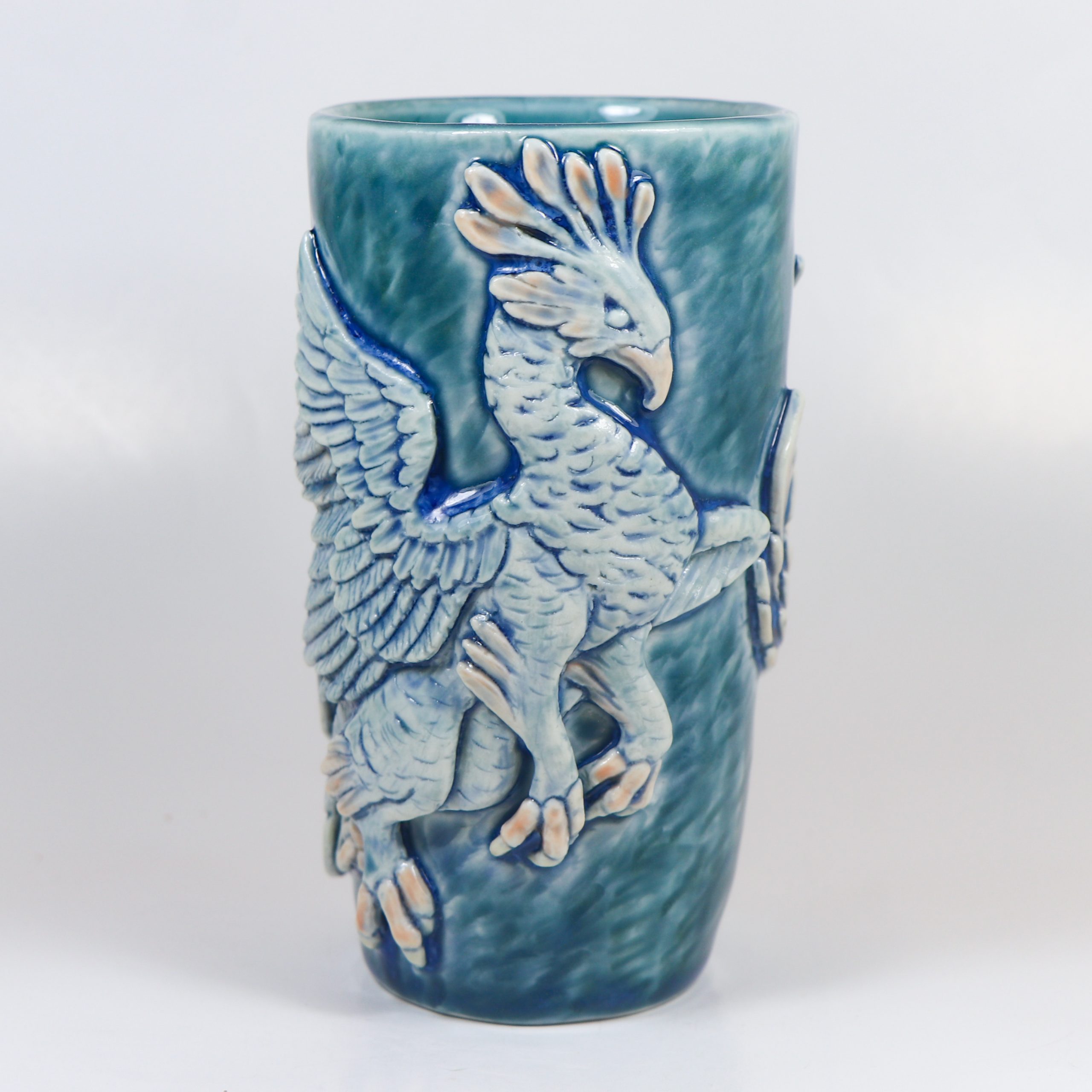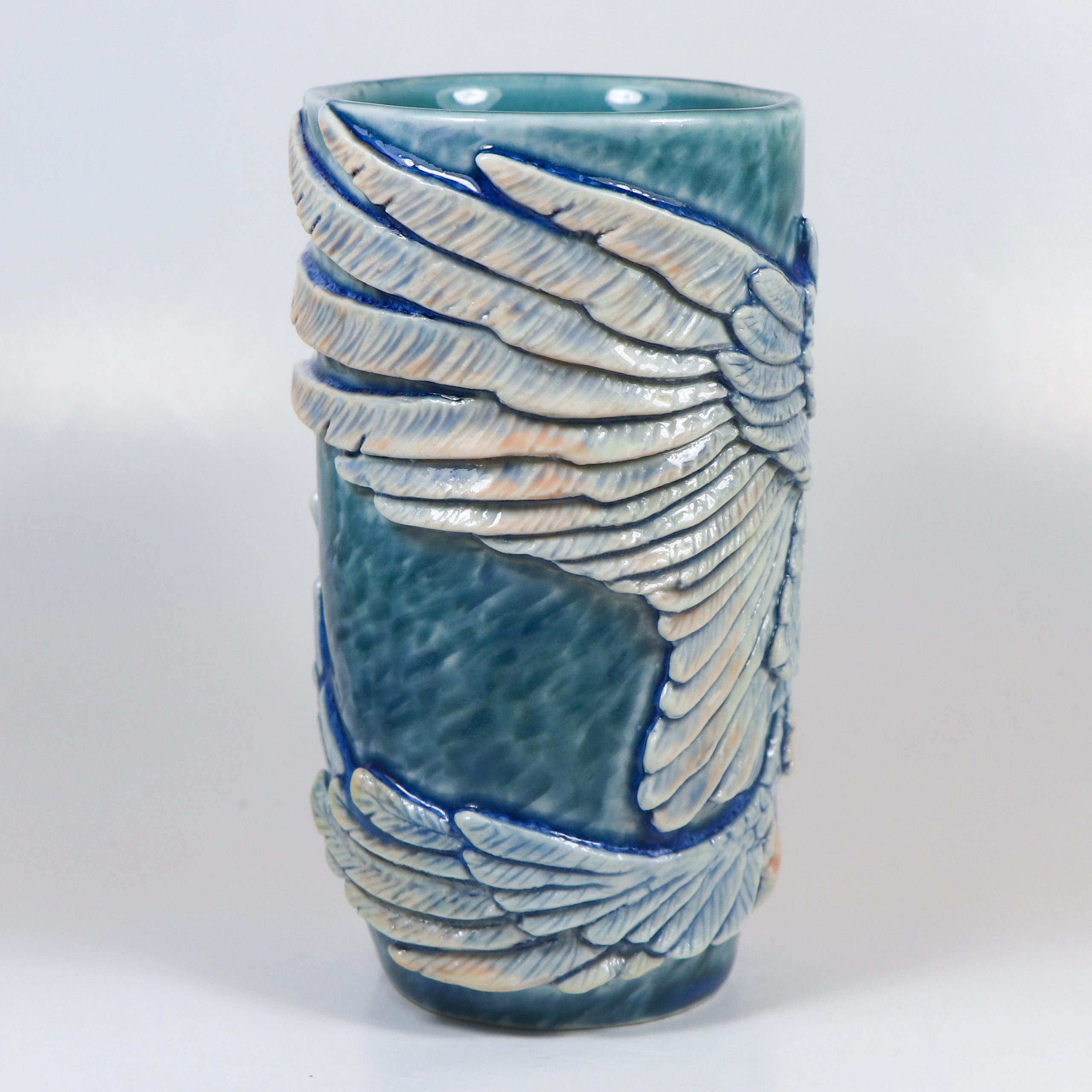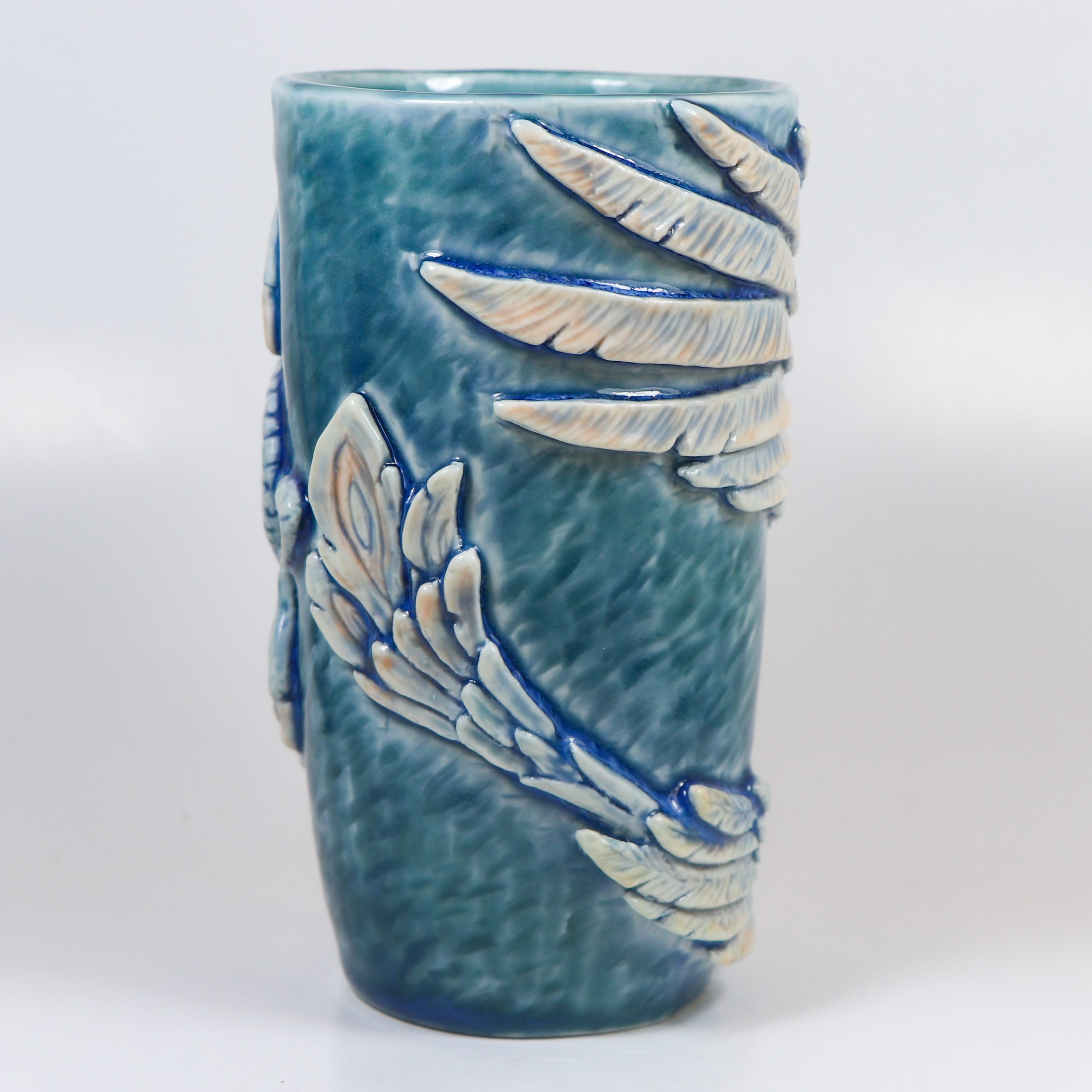 Wheel thrown Magnolia porcelain. Hand carved. Celadon glazes. Fired ^10. 5 1/4″h x 3″w