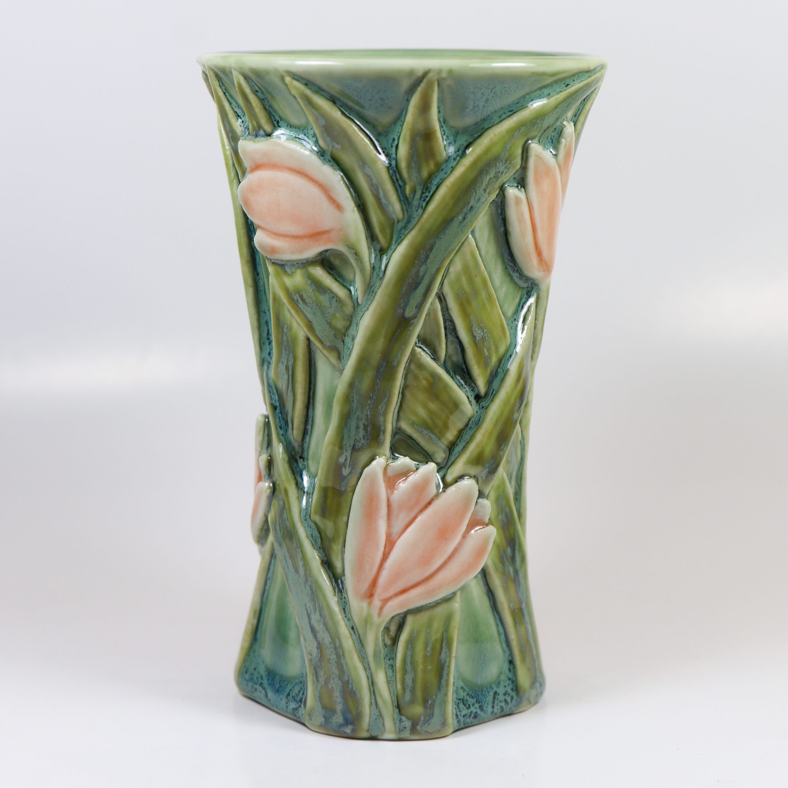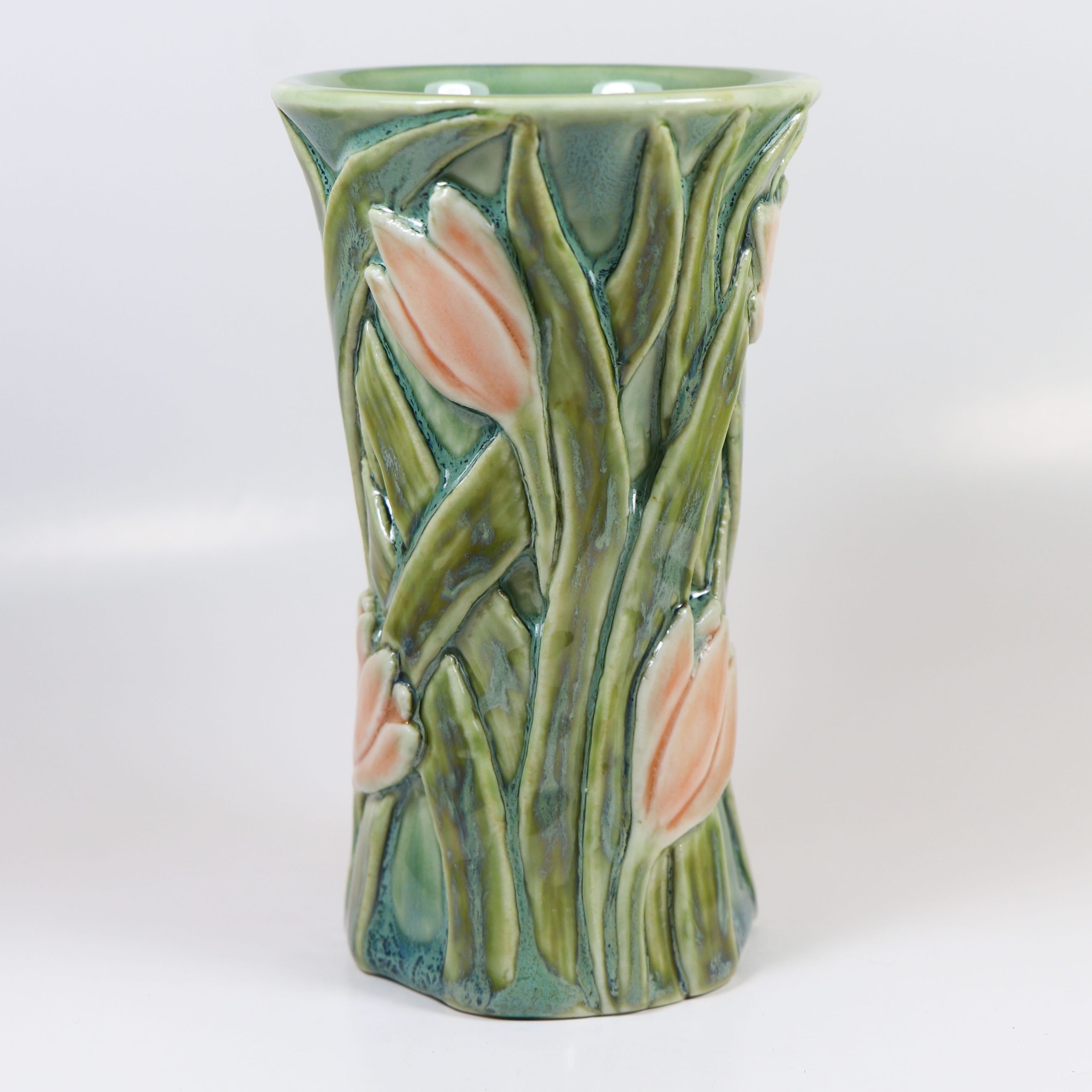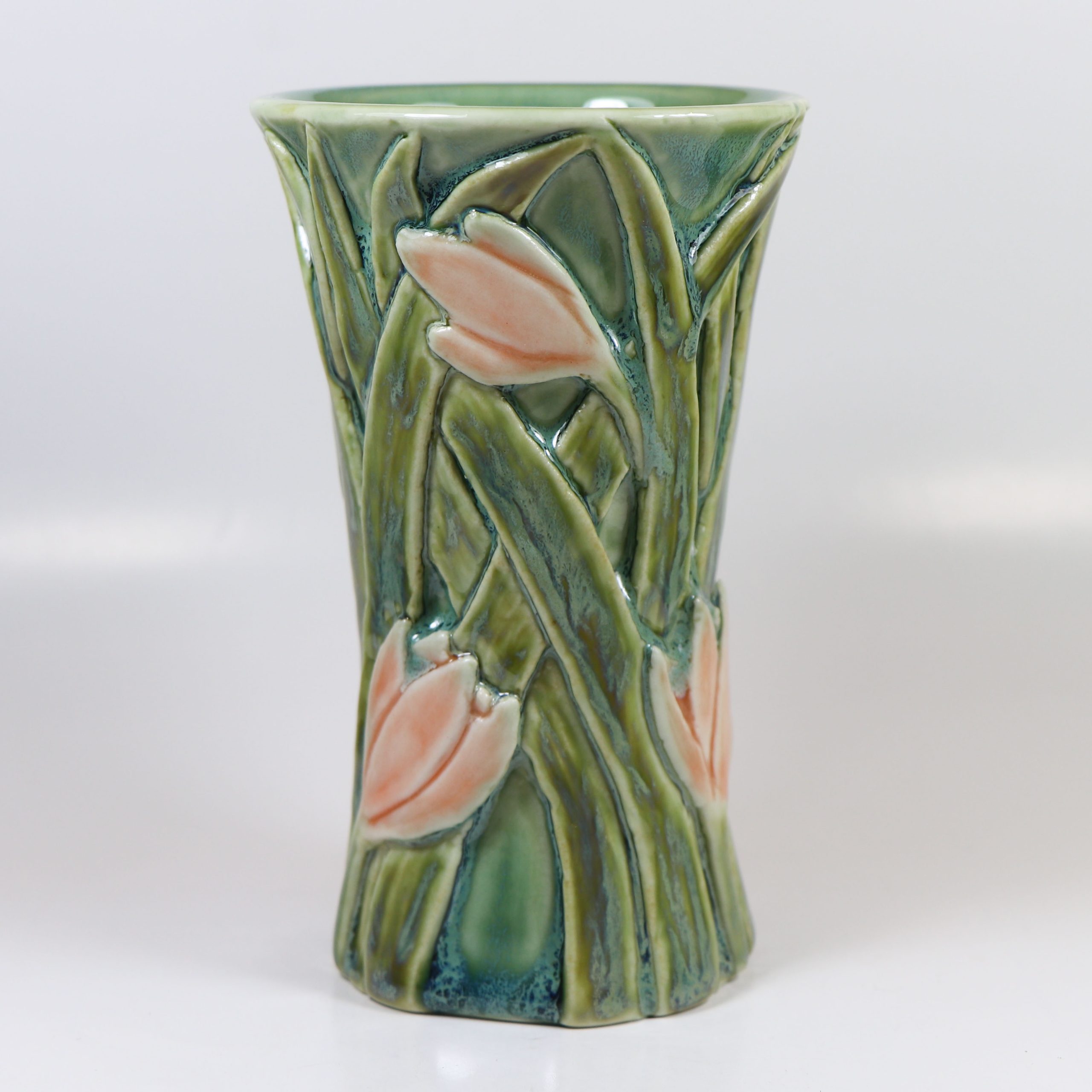 Wheel thrown Magnolia porcelain. Hand carved. Celadon glazes. Fired ^10. 5″h x 3″w